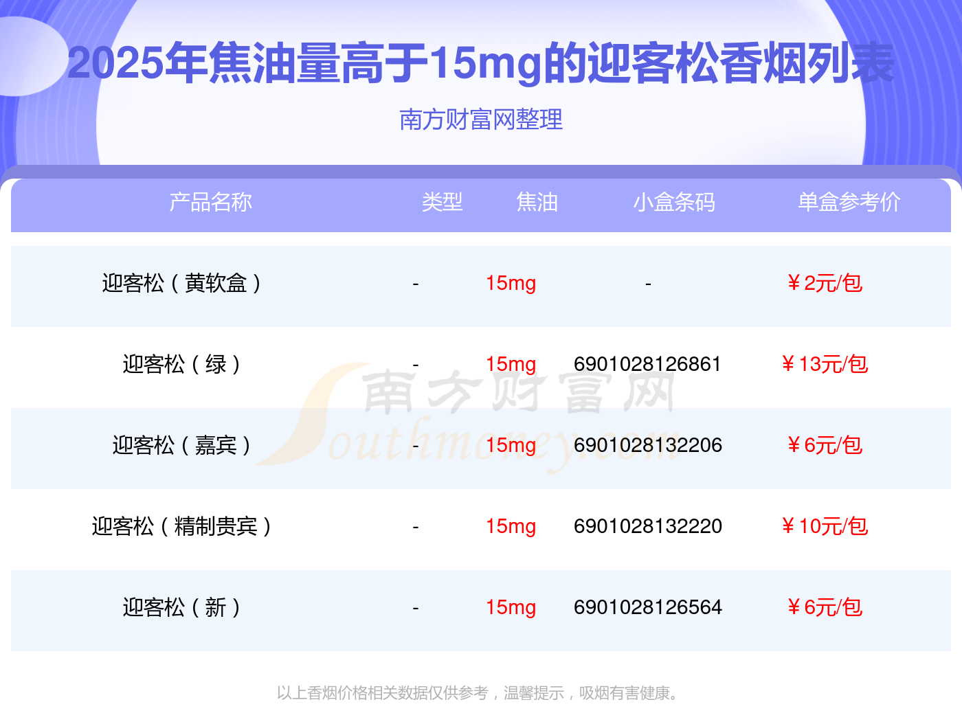 焦油量高于15mg的迎客松香煙有哪些?擇煙網(wǎng)為大家整理盤點(diǎn),分別有:迎客松(黃軟盒)、迎客松(綠)、迎客松(嘉賓)、迎客松(精制貴賓)、迎客松(新)等,具體價(jià)格如下: