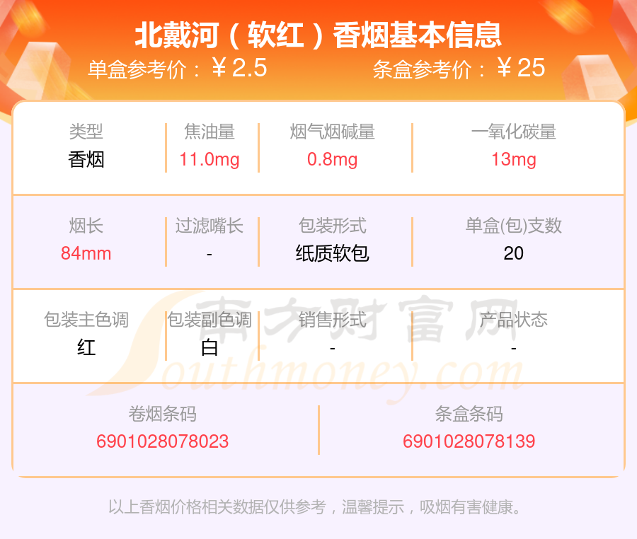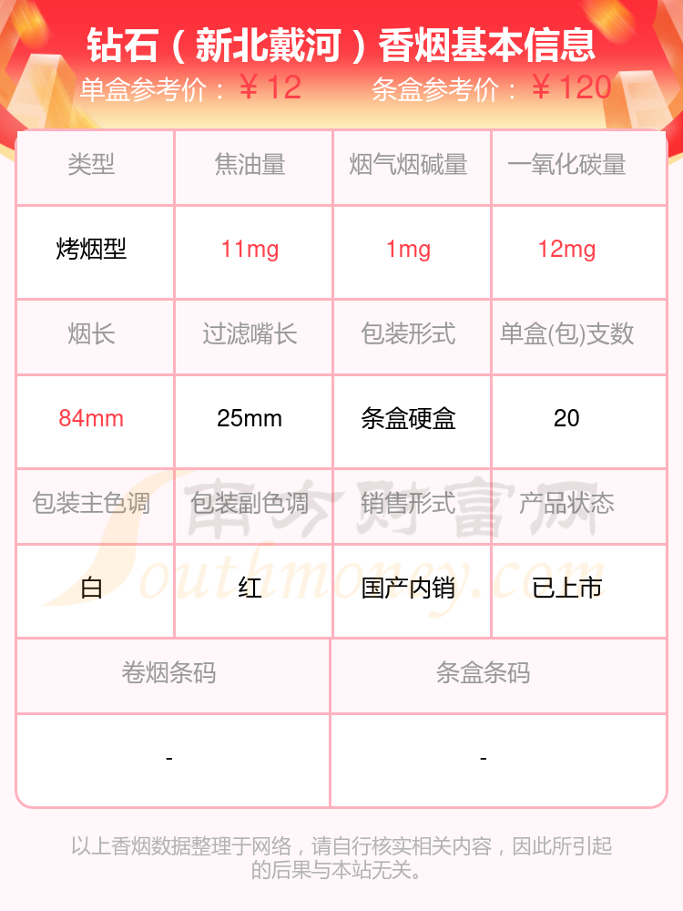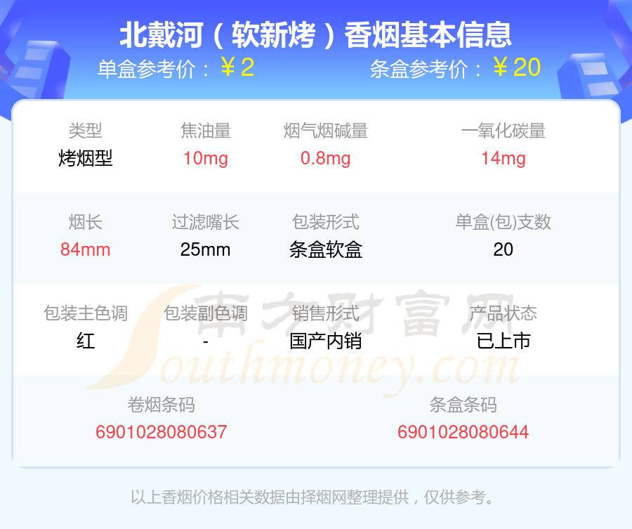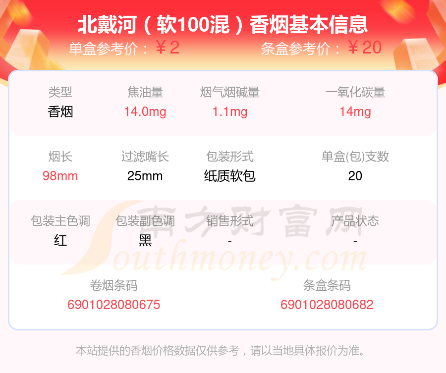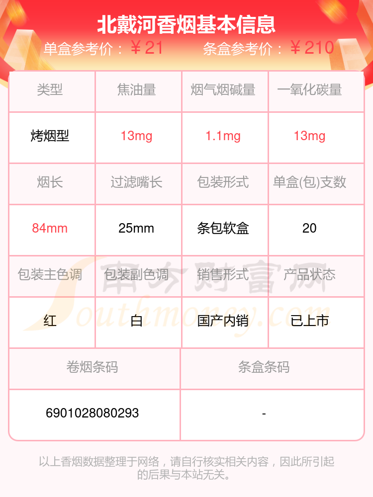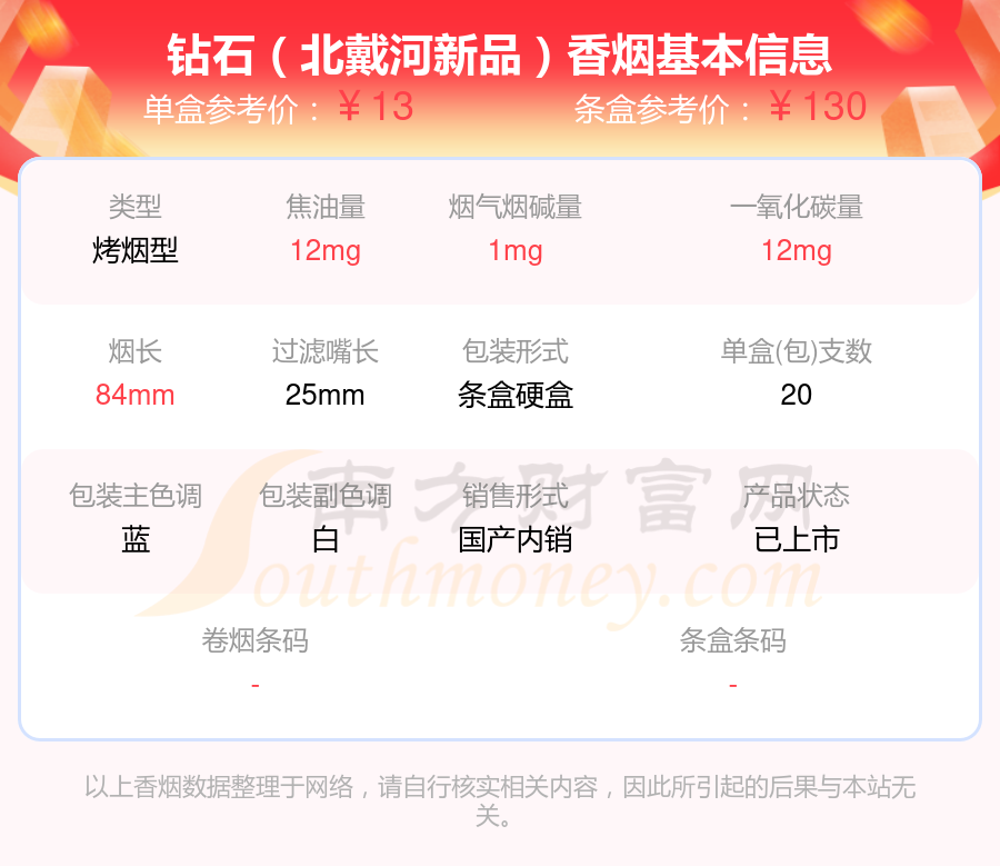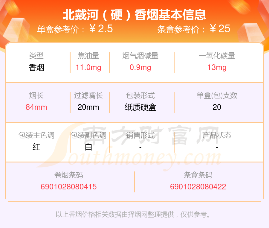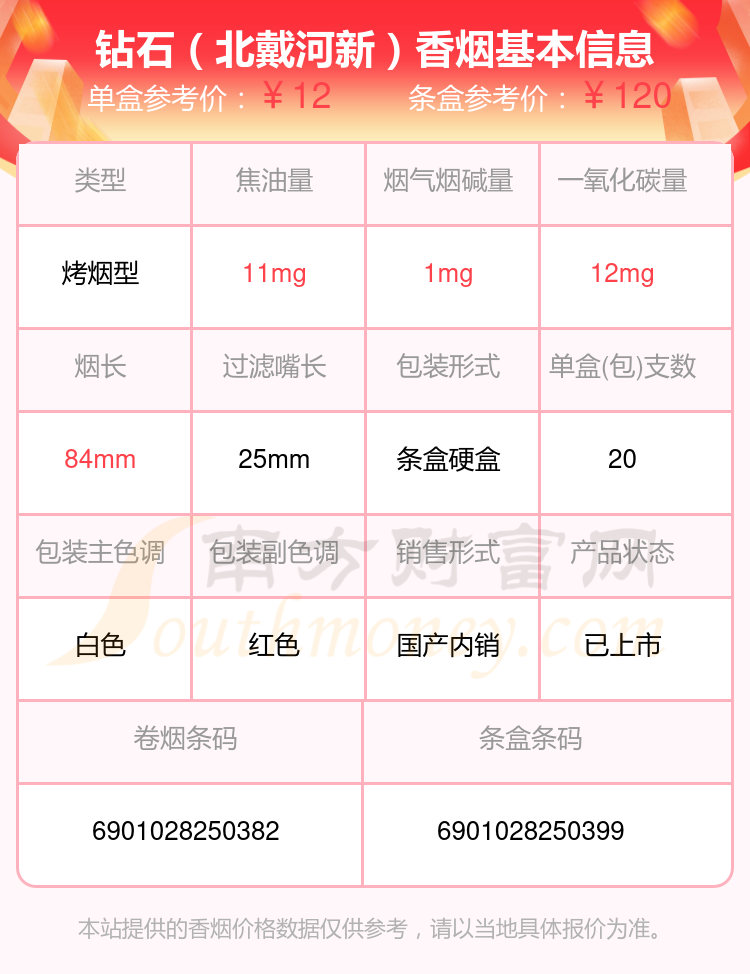 煙堿量2mg以下的北戴河香煙有哪些?擇煙網(wǎng)為大家整理盤點,有北戴河(軟烤)、北戴河(軟100混)、北戴河、鉆石(北戴河新)、鉆石(北戴河新品)、鉆石(新北戴河)、北戴河(硬)、北戴河(軟紅)、北戴河(醇和)、北戴河(軟新烤)等,詳細(xì)價格如下: