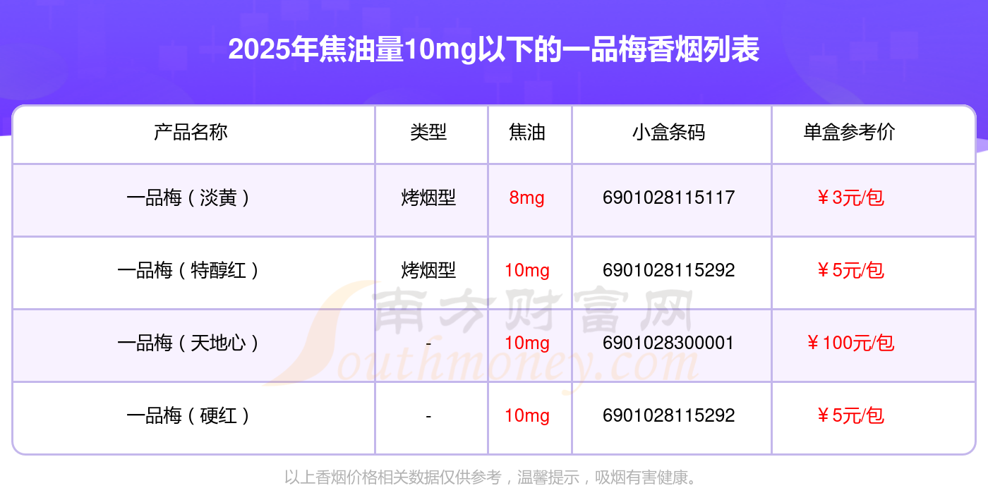 一品梅香煙焦油量10mg以下的煙有哪些?擇煙網(wǎng)為大家整理提供,分別有:一品梅(淡黃)、一品梅(特醇紅)、一品梅(天地心)、一品梅(硬紅)等,具體價格如下: