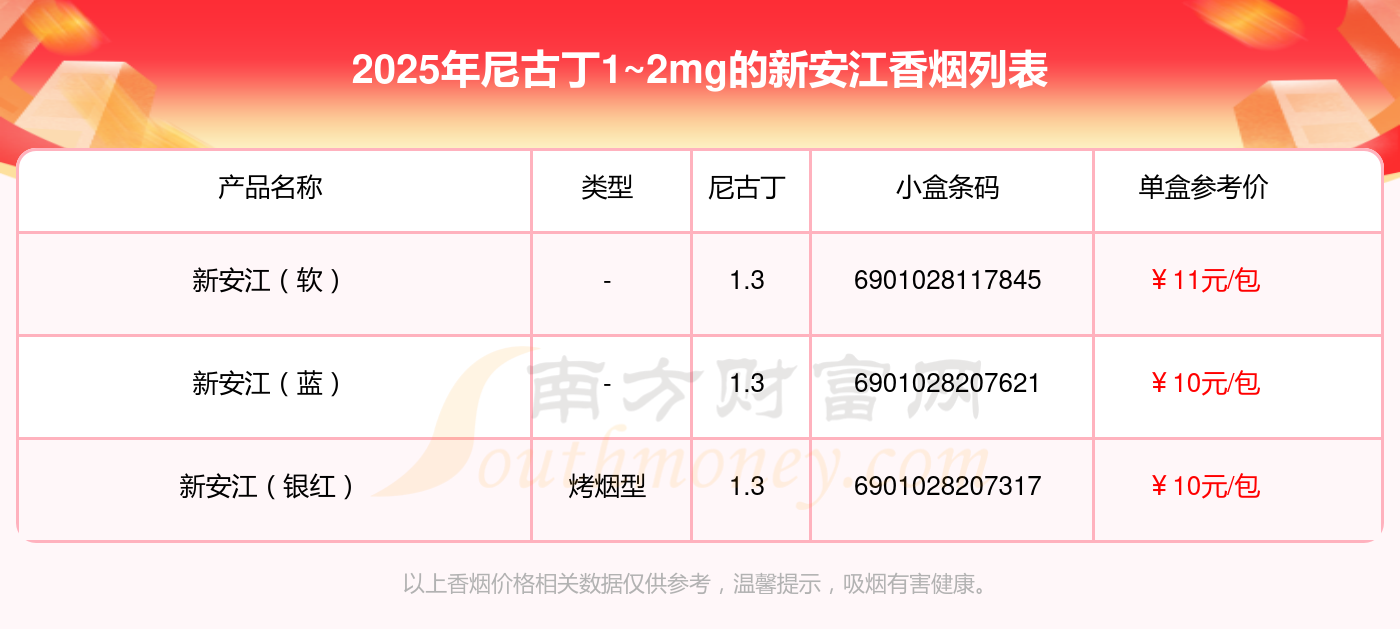擇煙網(wǎng)為大家盤點(diǎn)了新安江香煙尼古丁1~2mg的,分別有新安江(軟)、新安江(藍(lán))、新安江(銀紅)等,詳細(xì)價(jià)格如下: