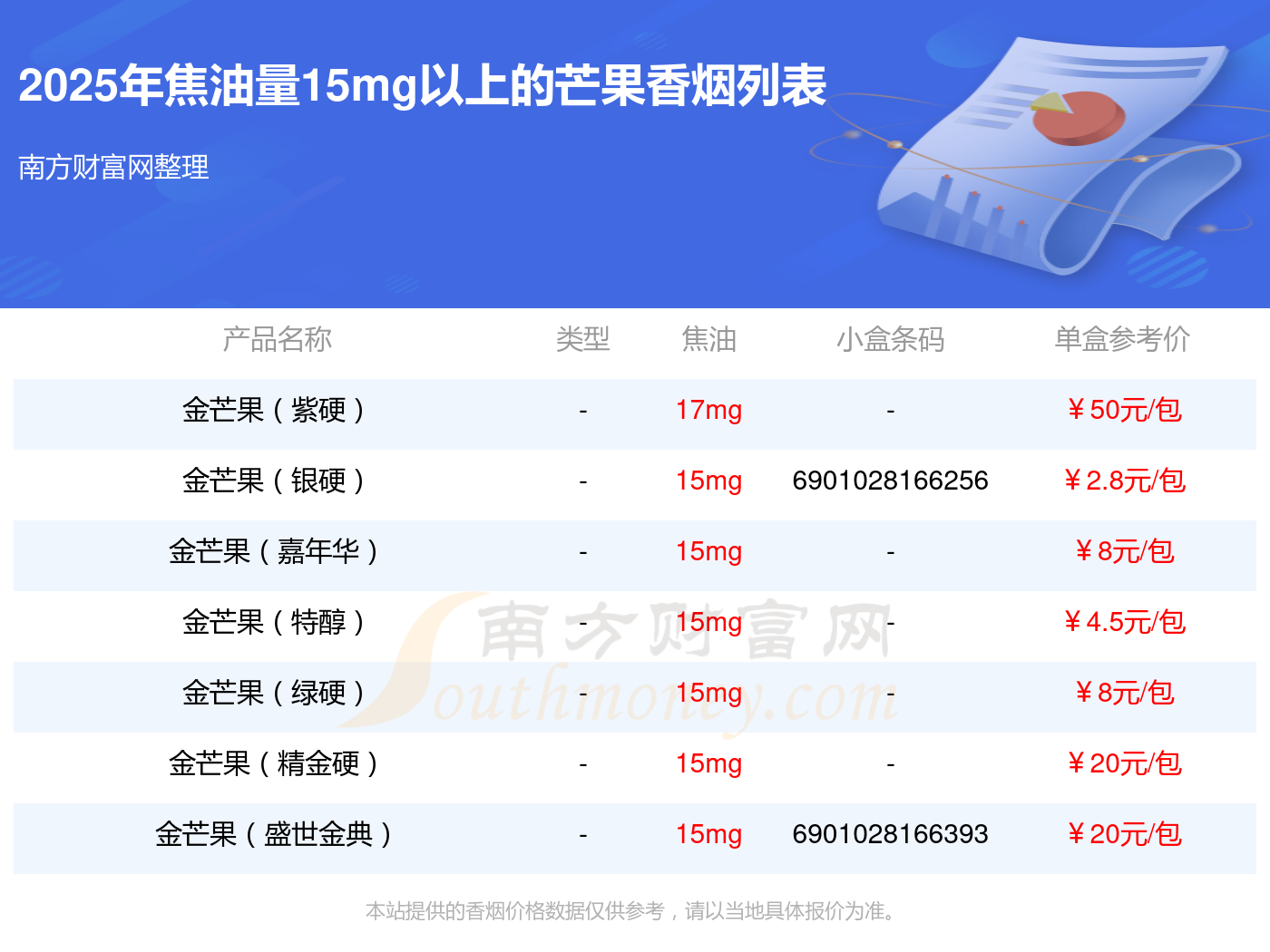 擇煙網(wǎng)為大家盤點(diǎn)了芒果香煙焦油量15mg以上的,分別有金芒果(紫硬)、金芒果(銀硬)、金芒果(嘉年華)、金芒果(特醇)、金芒果(綠硬)、金芒果(精金硬)、金芒果(盛世金典)等,具體價(jià)格如下: