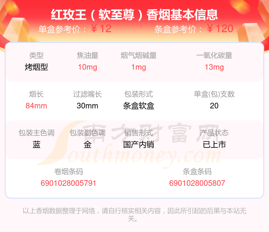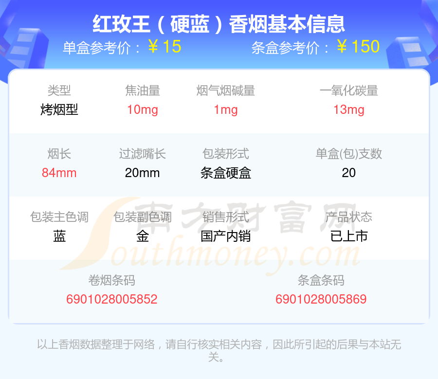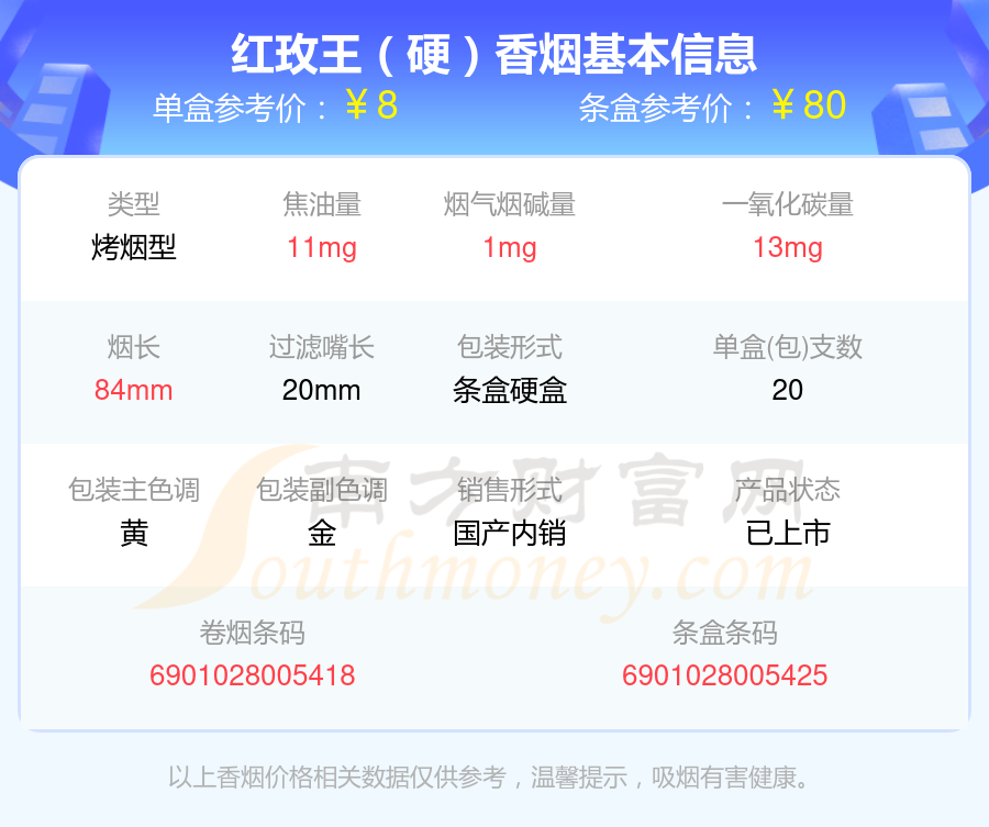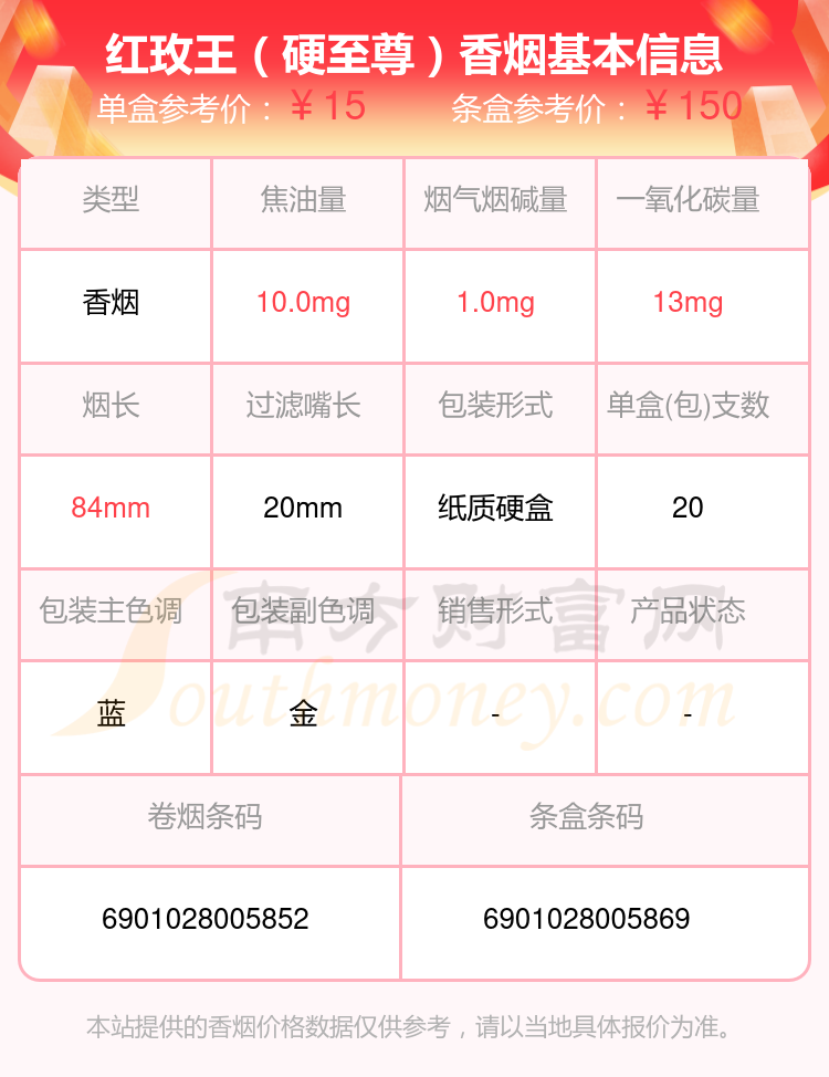 擇煙網(wǎng)為大家盤點了焦油量8到15mg左右的紅玫王香煙,分別有紅玫王(硬)、紅玫王(硬至尊)、紅玫王(硬藍)、紅玫王(軟至尊)等,具體價格如下: