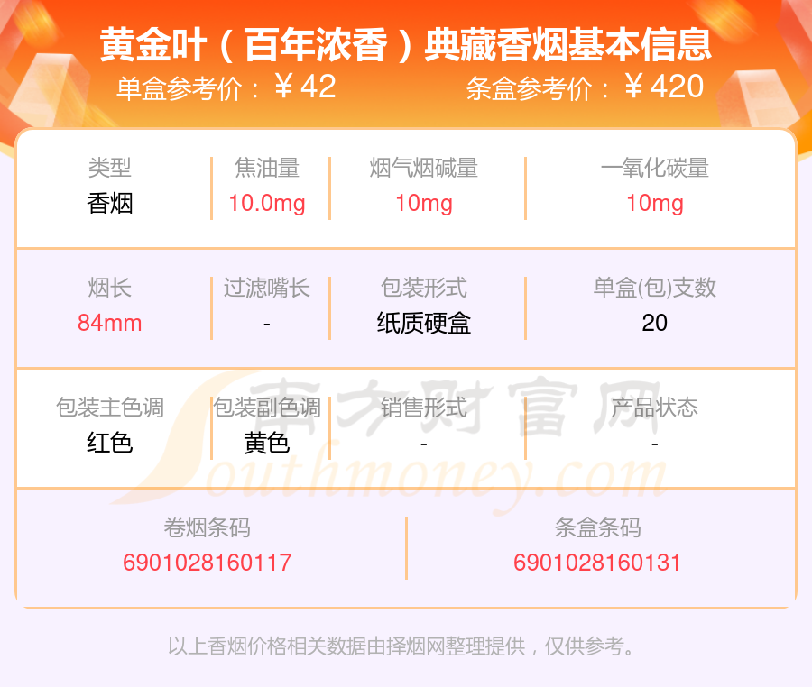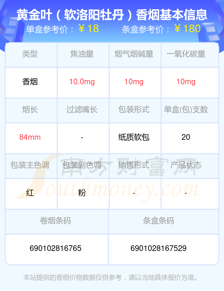 擇煙網(wǎng)為大家盤點(diǎn)了黃金葉香煙尼古丁量高于4mg的,分別有黃金葉(軟洛陽(yáng)牡丹)、黃金葉(百年濃香)典藏等,具體價(jià)格如下: