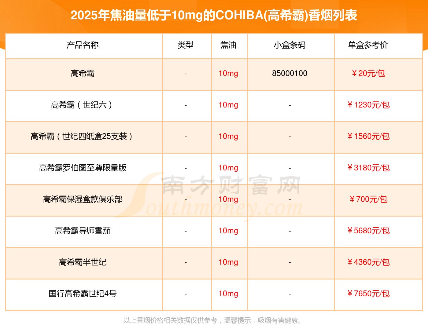 高希霸參考價(jià)20.0元/包、高希霸(世紀(jì)六)參考價(jià)1230元/包、高希霸(世紀(jì)四紙盒25支裝)參考價(jià)1560元/包、高希霸羅伯圖至尊限量版參考價(jià)3180元/包、高希霸保濕盒款俱樂(lè)部參考價(jià)700元/包、高希霸導(dǎo)師雪茄參考價(jià)5680元/包、高希霸半世紀(jì)參考價(jià)4360元/包、國(guó)行高希霸世紀(jì)4號(hào)參考價(jià)7650元/包等。