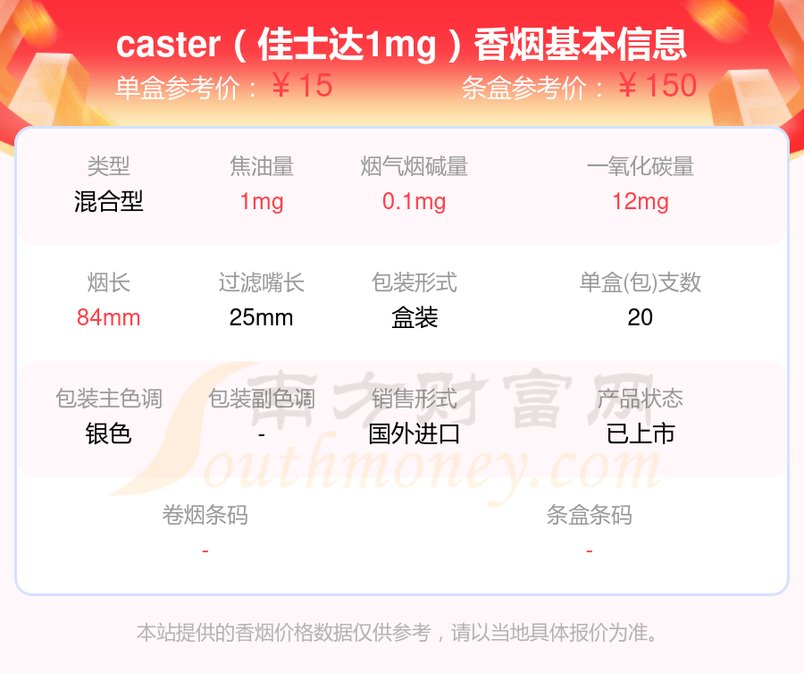擇煙網(wǎng)為大家盤點(diǎn)了CASTER(佳士達(dá))香煙焦油量低于5mg的,分別有佳士達(dá)(紅中免)、佳士達(dá)(硬紅)、佳士達(dá)(紅)、佳士達(dá)(黃)、caster(佳士達(dá)1mg)等,詳細(xì)價(jià)格如下: