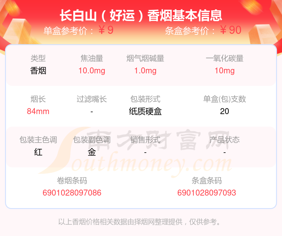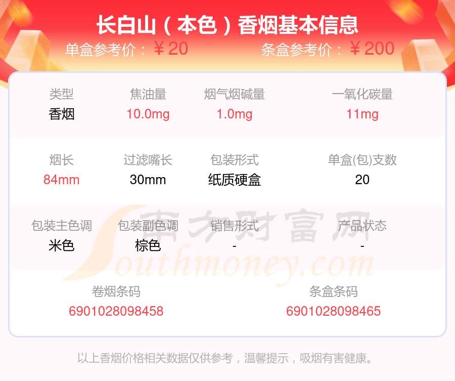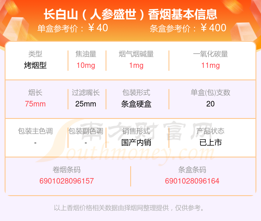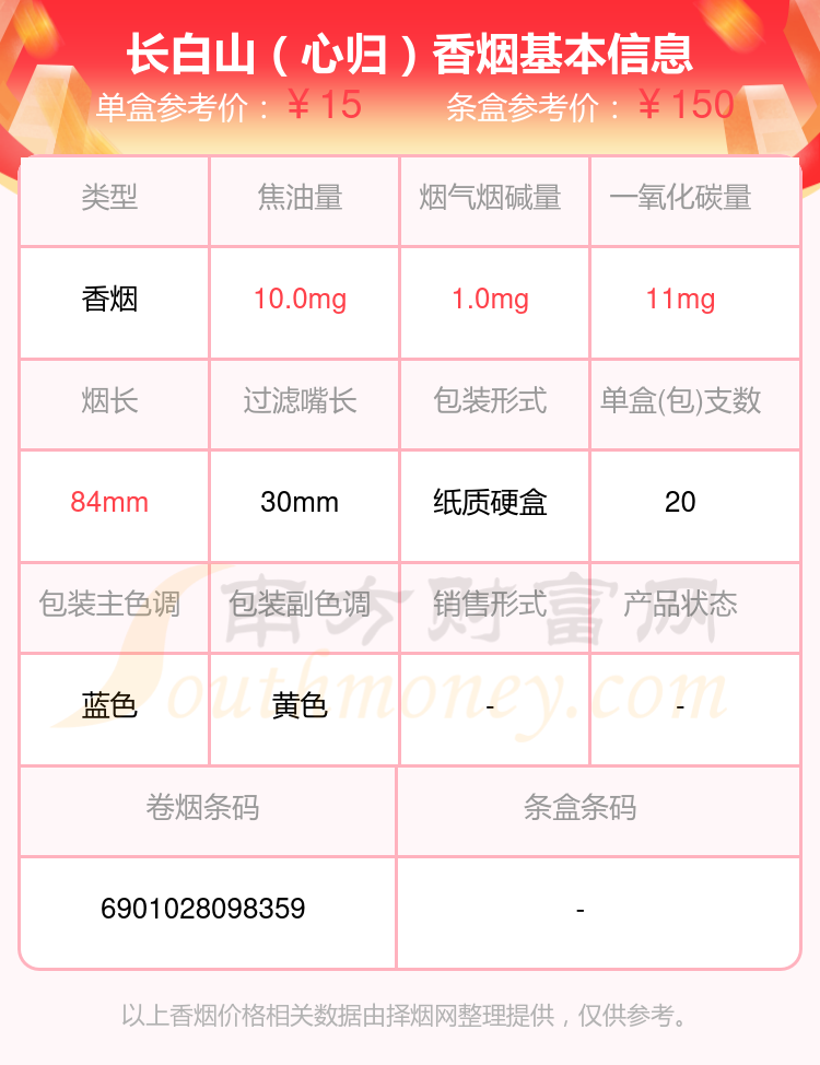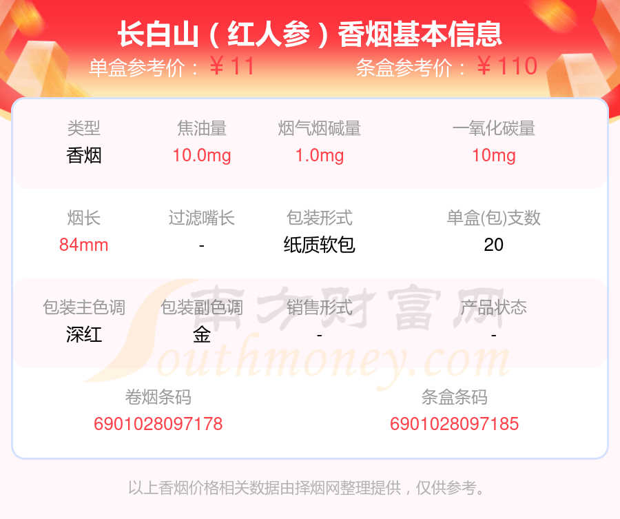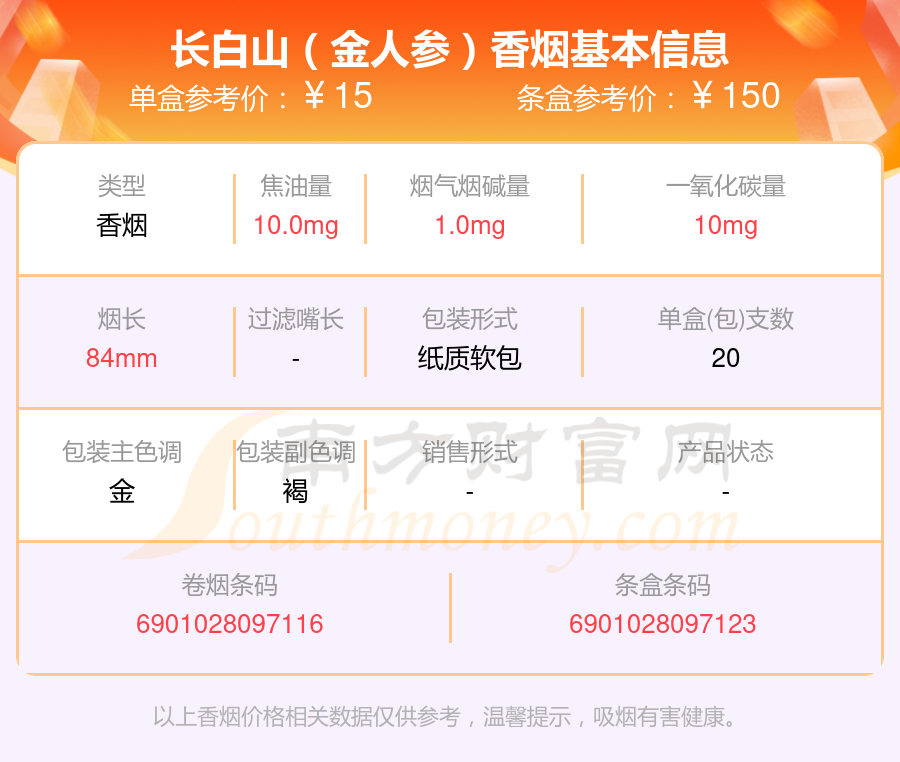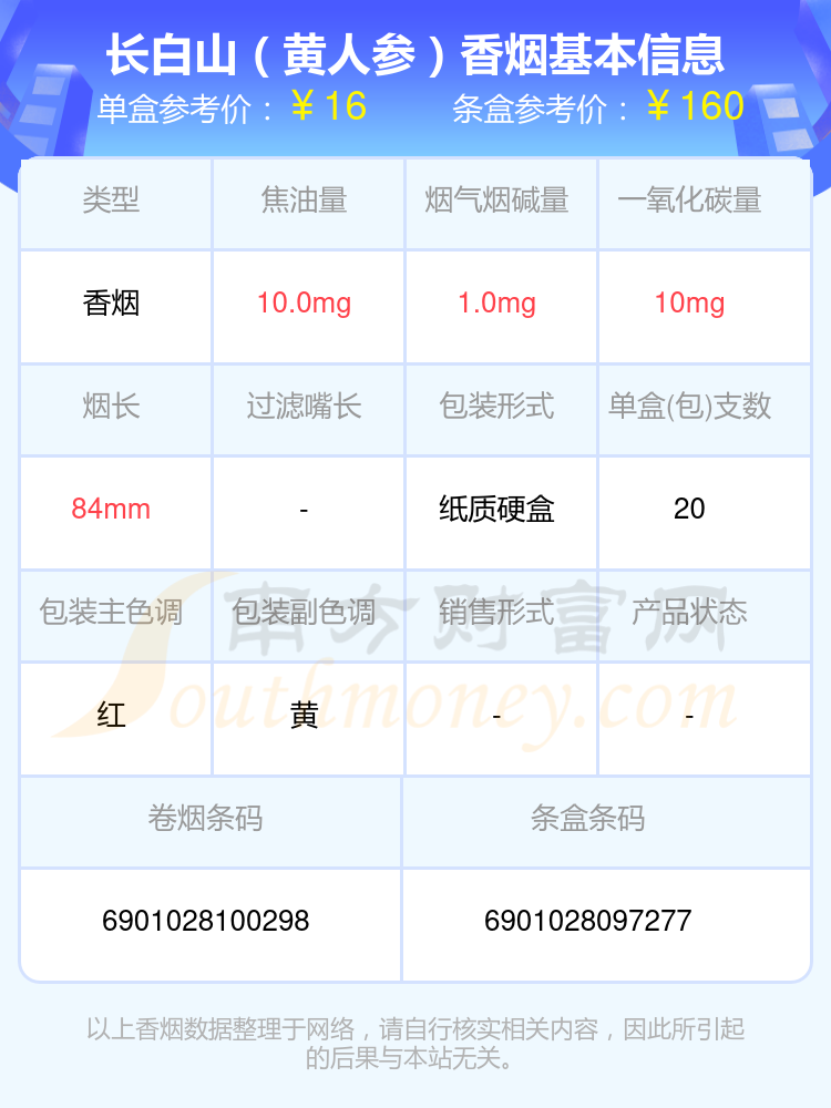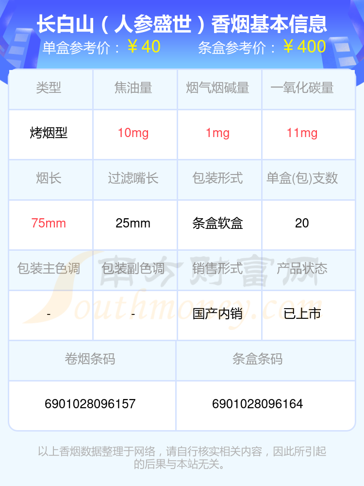 長白山(好運)參考價9.0元/包、長白山(紅人參)參考價11.0元/包、長白山(黃人參)參考價16.0元/包、長白山(金人參)參考價15.0元/包、長白山(本色)參考價20.0元/包、長白山(心歸)參考價15.0元/包、長白山(記憶1999)參考價13.0元/包、長白山(人參盛世)參考價40元/包、長白山(人參盛世)參考價40元/包、長白山(小香魁)參考價22.0元/包等。