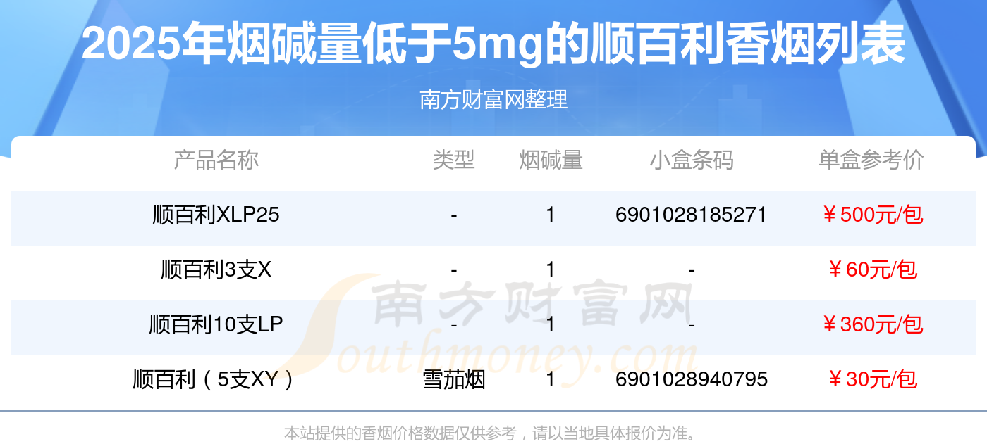 順百利香煙煙堿量低于5mg的煙分別有順百利XLP25參考價500元/包、順百利3支X參考價60元/包、順百利10支LP參考價360元/包、順百利(5支XY)參考價30元/包等。