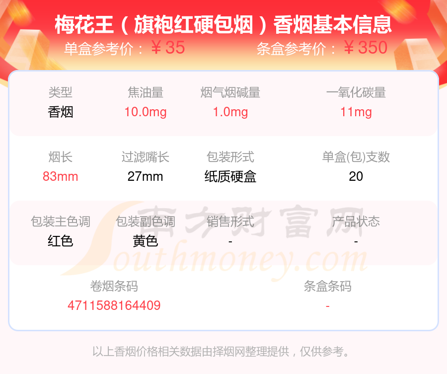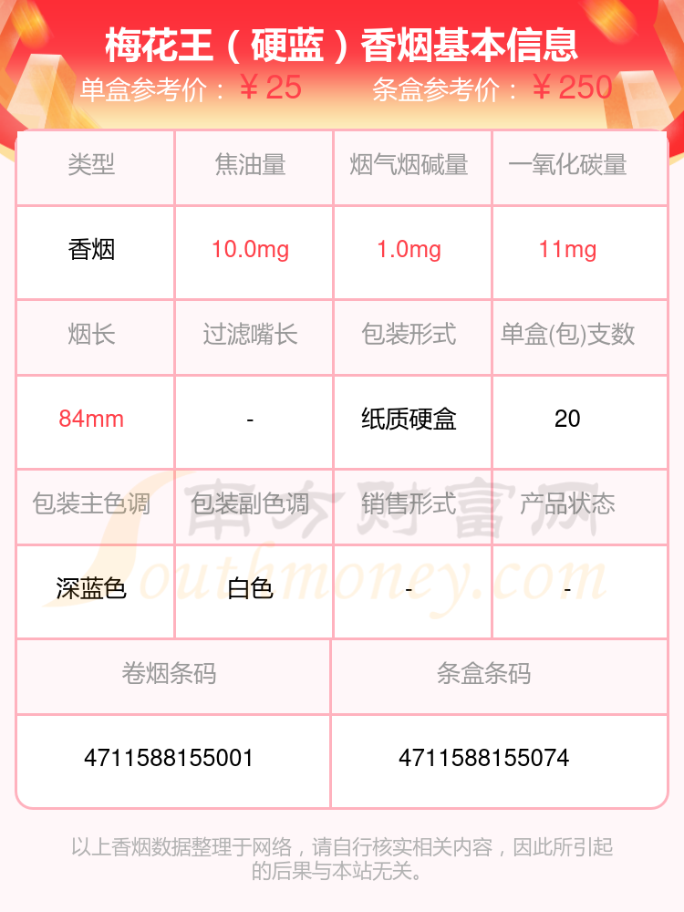 梅花王香煙尼古丁量5mg以下的煙分別有梅花王(硬紅)參考價26.0元/包、梅花王(硬藍(lán))參考價25.0元/包、梅花王(旗袍紅硬包煙)參考價35.0元/包等。