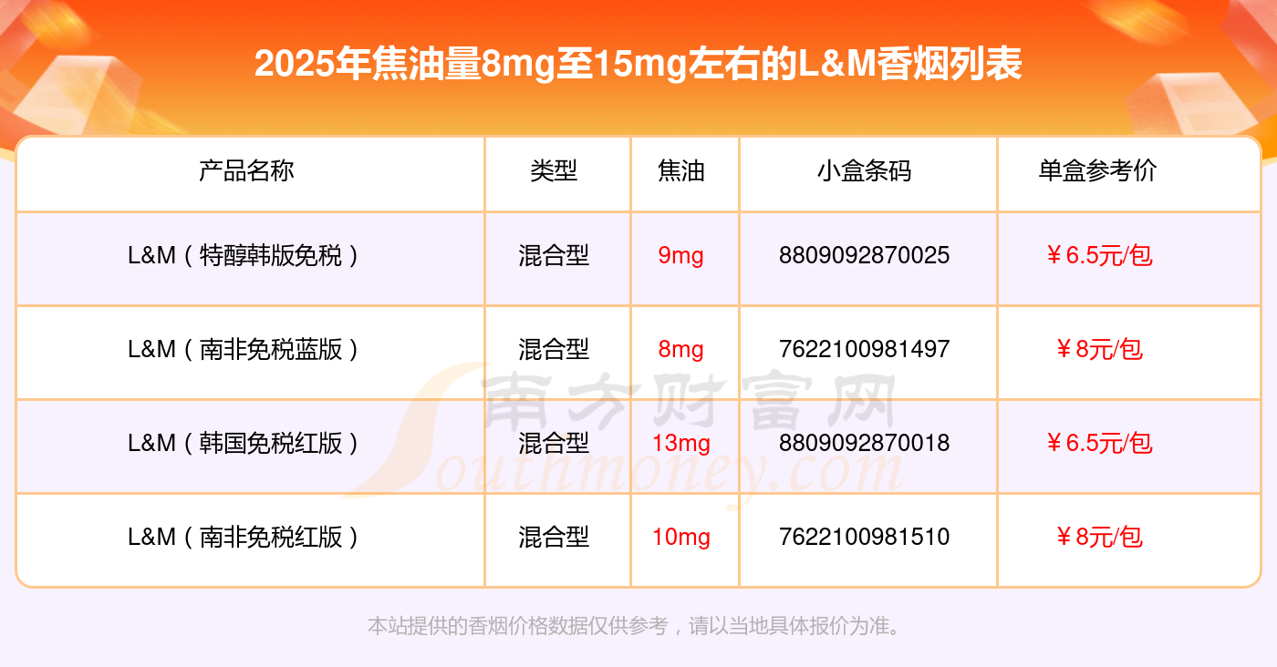 L&M(特醇韓版免稅)參考價(jià)6.5元/包、L&M(南非免稅藍(lán)版)參考價(jià)8.0元/包、L&M(韓國免稅紅版)參考價(jià)6.5元/包、L&M(南非免稅紅版)參考價(jià)8.0元/包等。