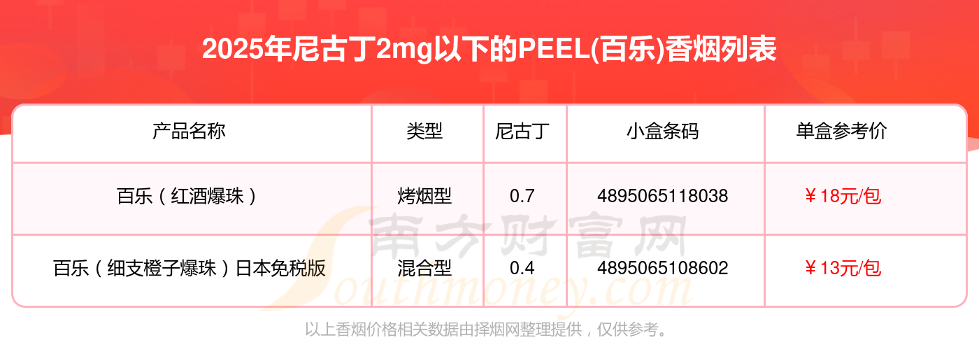 尼古丁2mg以下的PEEL(百樂)香煙有哪些?擇煙網(wǎng)為大家整理盤點,分別有:百樂(紅酒爆珠)、百樂(細支橙子爆珠)日本免稅版等,具體價格如下: