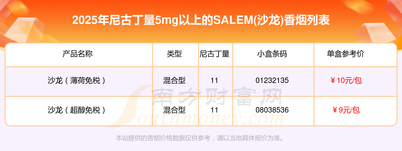 擇煙網(wǎng)為大家盤點了SALEM(沙龍)香煙尼古丁量5mg以上的,分別有沙龍(薄荷免稅)、沙龍(超醇免稅)等,具體價格如下: