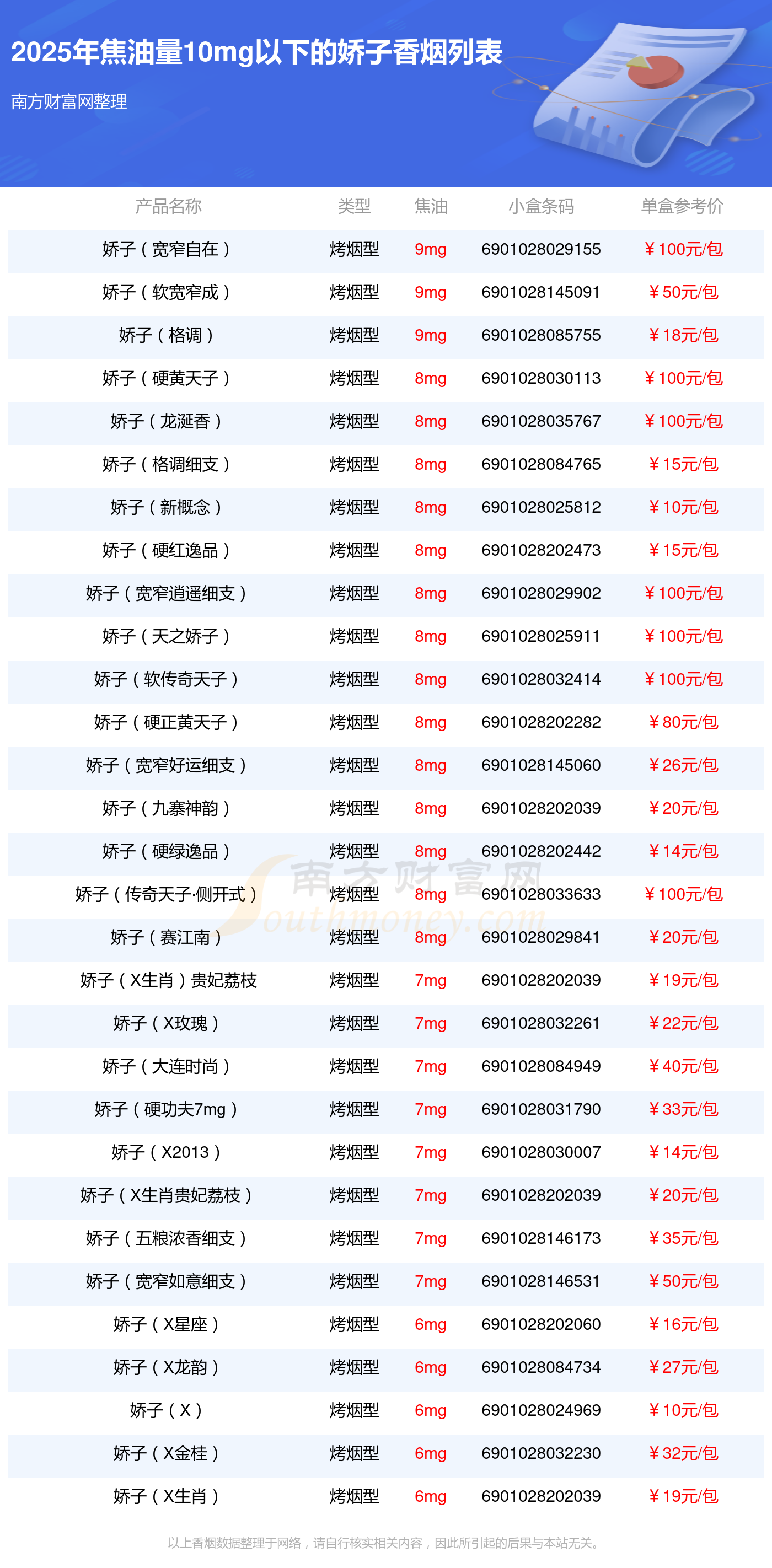 擇煙網(wǎng)為大家盤點(diǎn)了焦油量10mg以下的嬌子香煙,分別有嬌子(寬窄自在)、嬌子(軟寬窄成)、嬌子(格調(diào))、嬌子(硬黃天子)、嬌子(龍涎香)、嬌子(格調(diào)細(xì)支)、嬌子(新概念)、嬌子(硬紅逸品)、嬌子(寬窄逍遙細(xì)支)、嬌子(天之嬌子)等,具體價(jià)格如下: