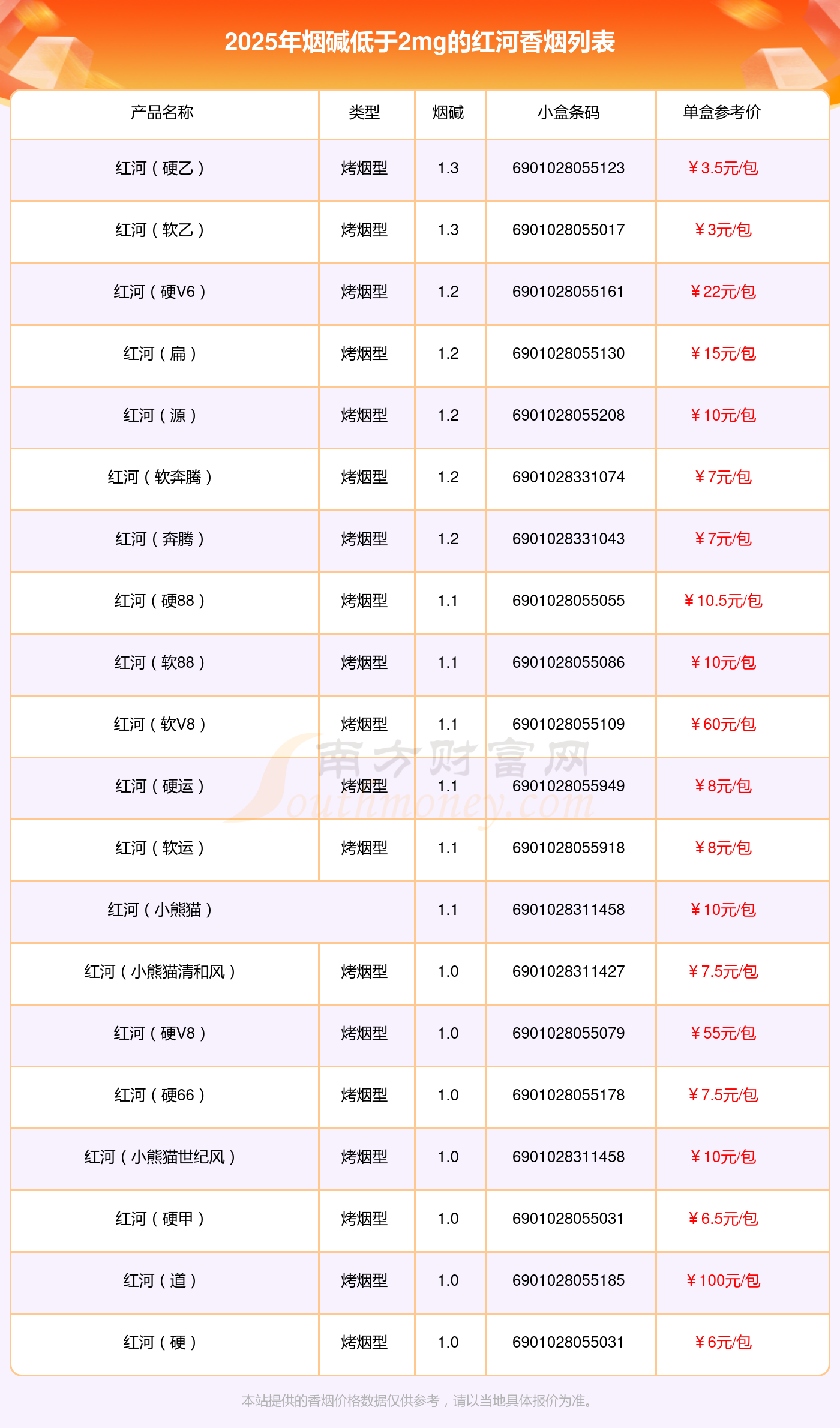 擇煙網(wǎng)為大家盤點(diǎn)了煙堿低于2mg的紅河香煙,有紅河(硬乙)、紅河(軟乙)、紅河(硬V6)、紅河(扁)、紅河(源)、紅河(軟奔騰)、紅河(奔騰)、紅河(硬88)、紅河(軟88)、紅河(軟V8)等,詳細(xì)價(jià)格如下: