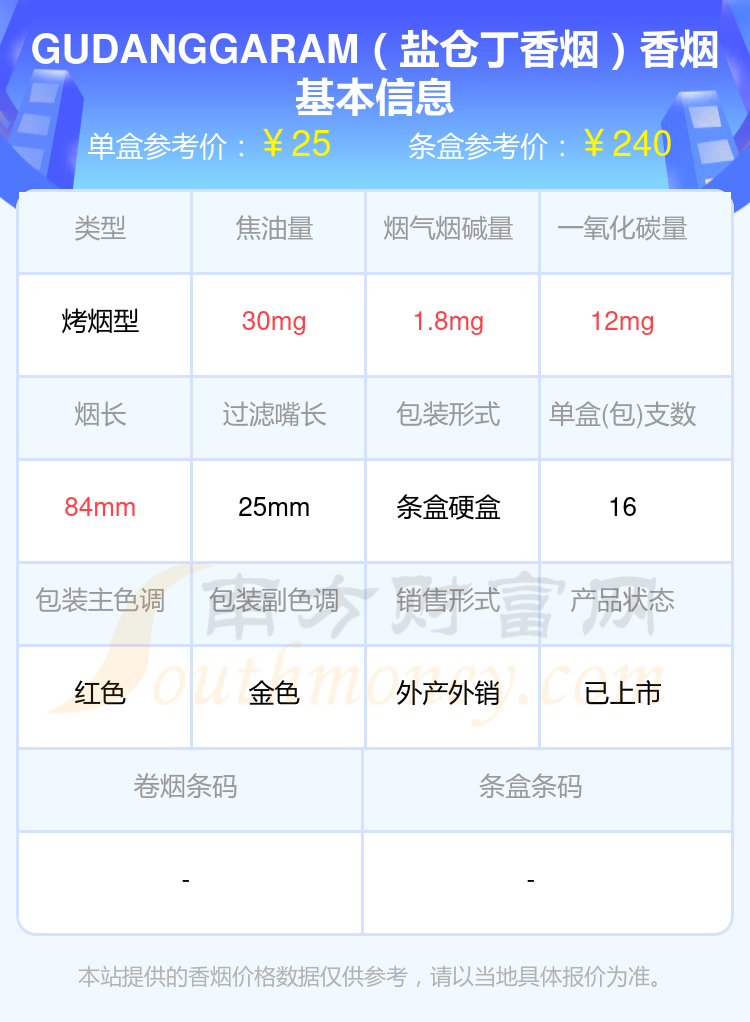 GUDANG GARAM(鹽倉(cāng))香煙煙堿量低于10mg的煙有GUDANGGARAM(鹽倉(cāng)丁香煙)、鹽倉(cāng)(太陽(yáng)版)紅16支裝等,具體價(jià)格如下: