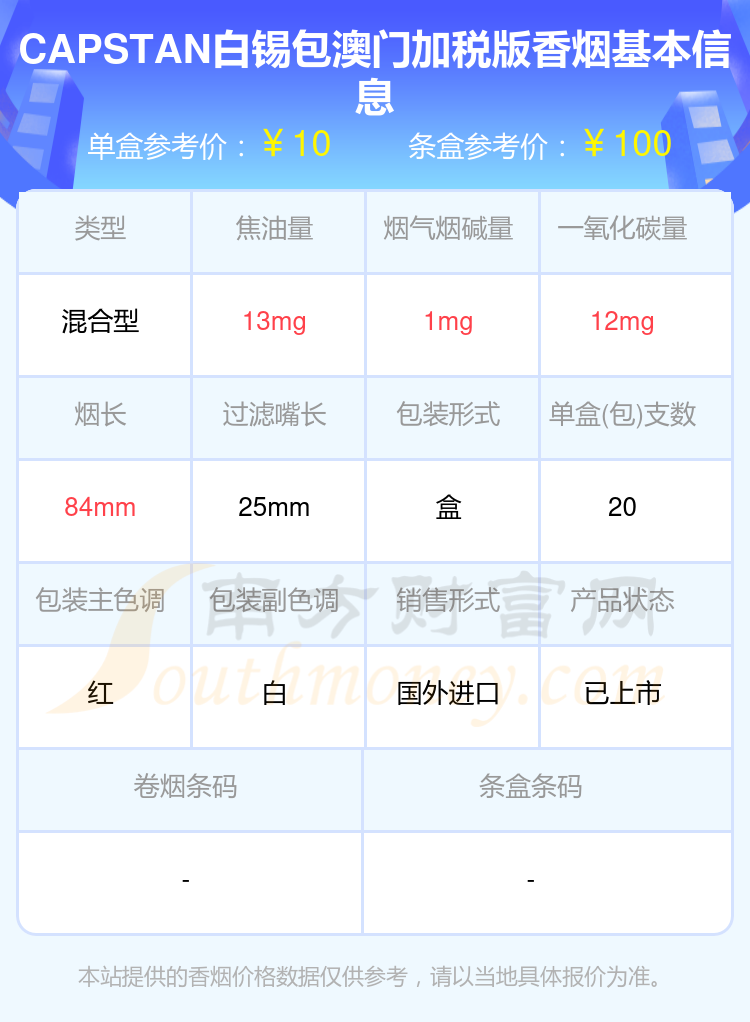 CAPSTAN參考價(jià)8元/包、CAPSTAN白錫包澳門加稅版參考價(jià)10元/包、萬寶路(硬紅中免)參考價(jià)9元/包等。