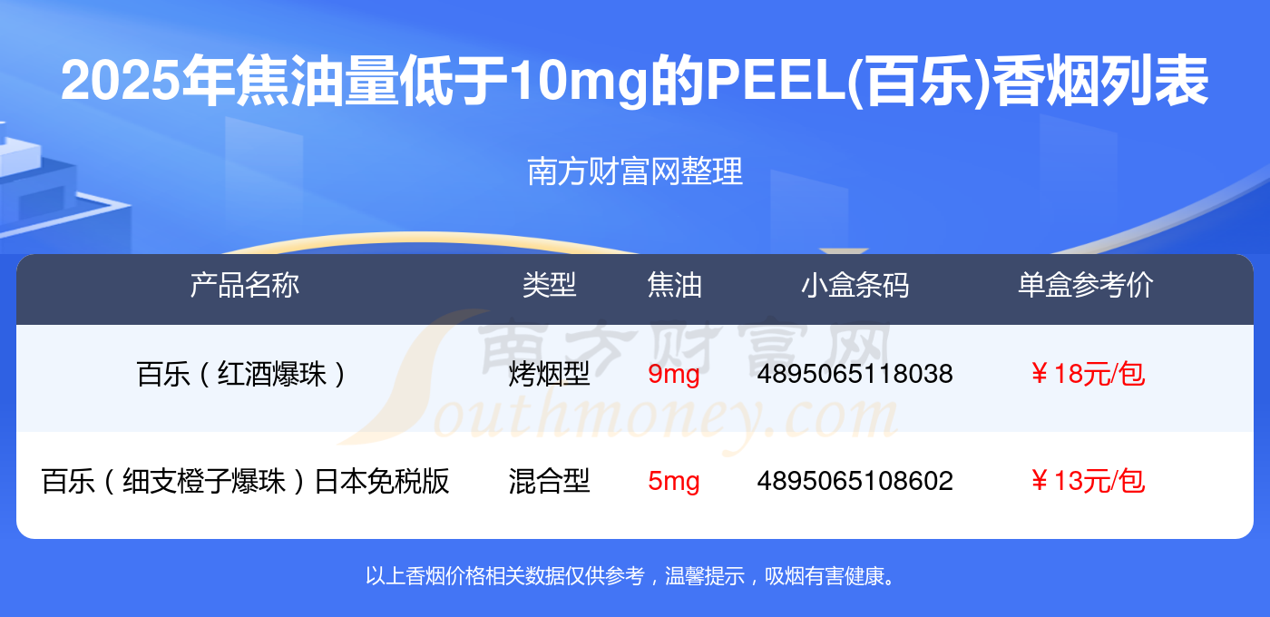 擇煙網(wǎng)為大家盤點(diǎn)了PEEL(百樂)香煙焦油量低于10mg的煙,有以下這些: