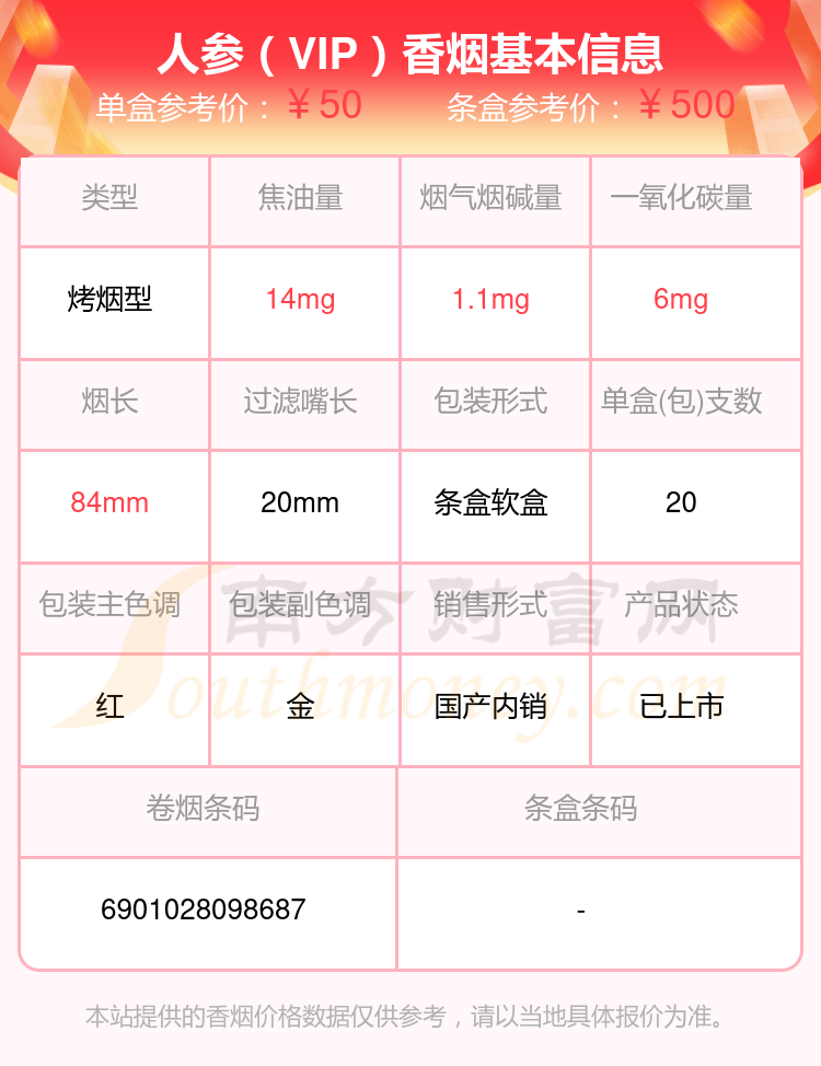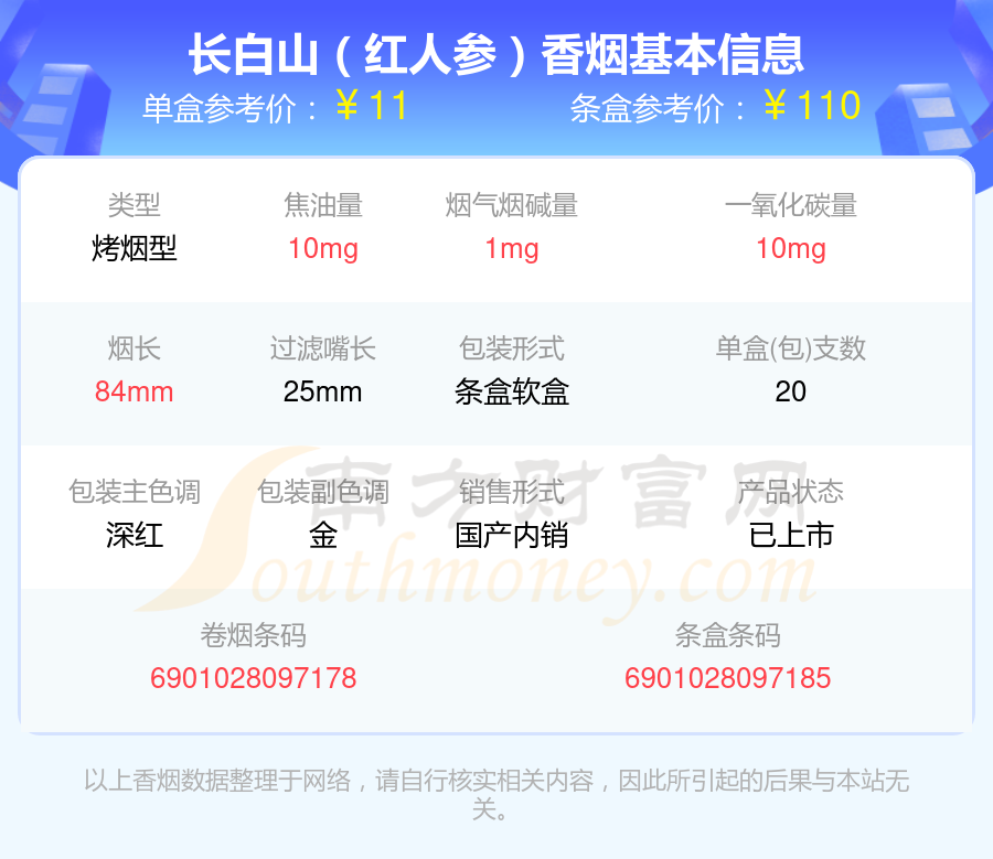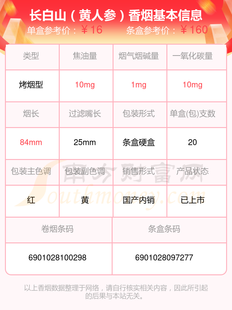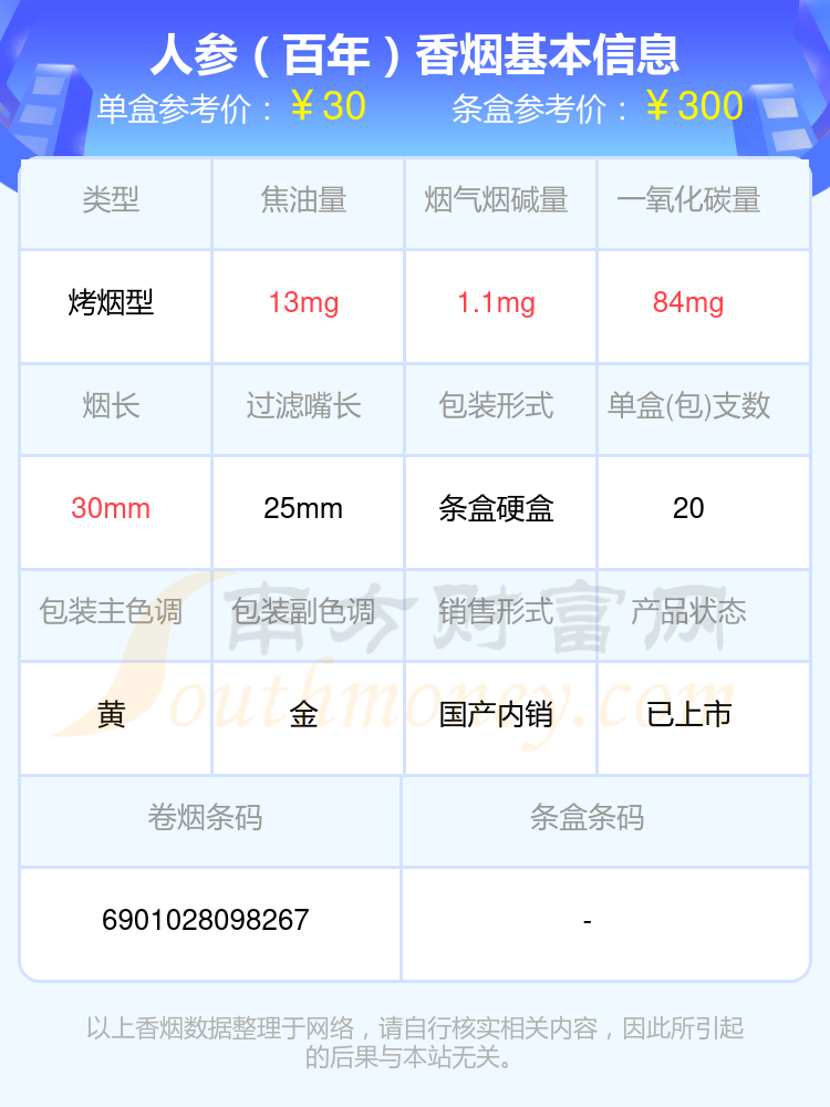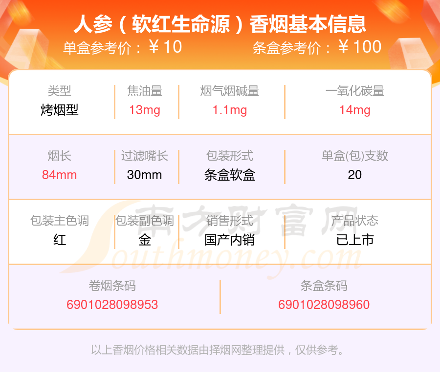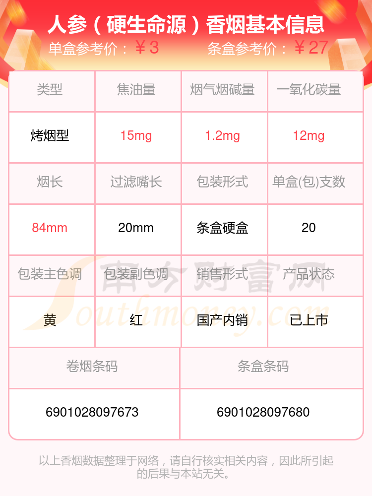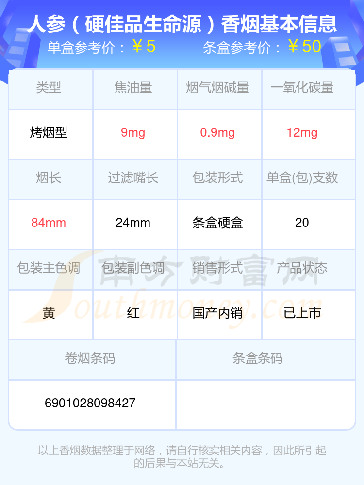 擇煙網為大家盤點了尼古丁量低于4mg的人參香煙,分別有人參(硬生命源)、人參(硬百年醇香)、人參(百年)、人參(陽光)、人參(VIP)、人參(軟紅生命源)、長白山(黃人參)、長白山(紅人參)、長白山(金人參)、人參(硬佳品生命源)等,具體價格如下:
