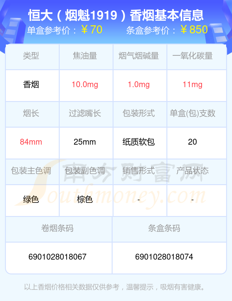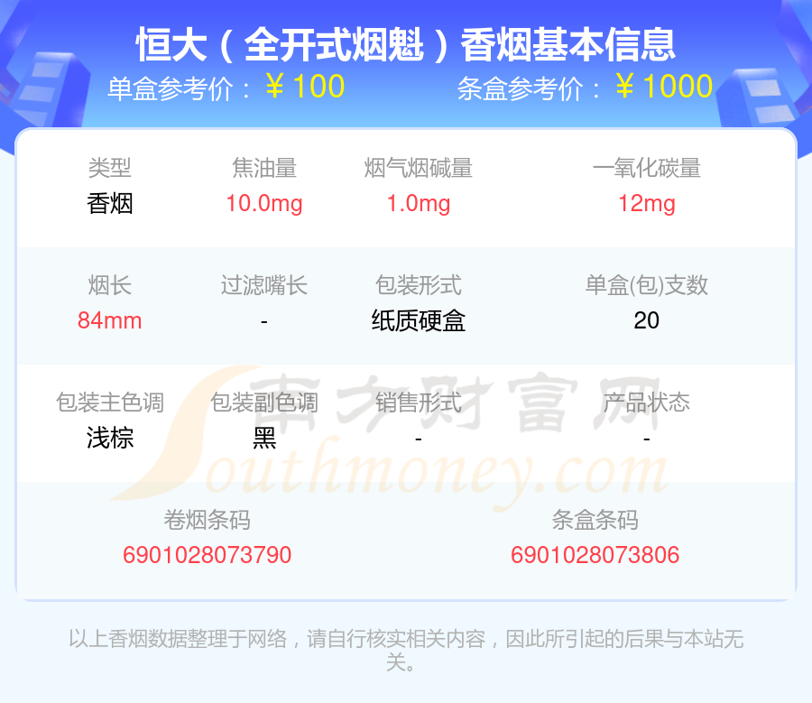 恒大香煙超過50元的煙有恒大(煙魁1919)、恒大(煙魁1949)、恒大(煙魁1949中支)、恒大(全開式煙魁)等,具體價格如下:
