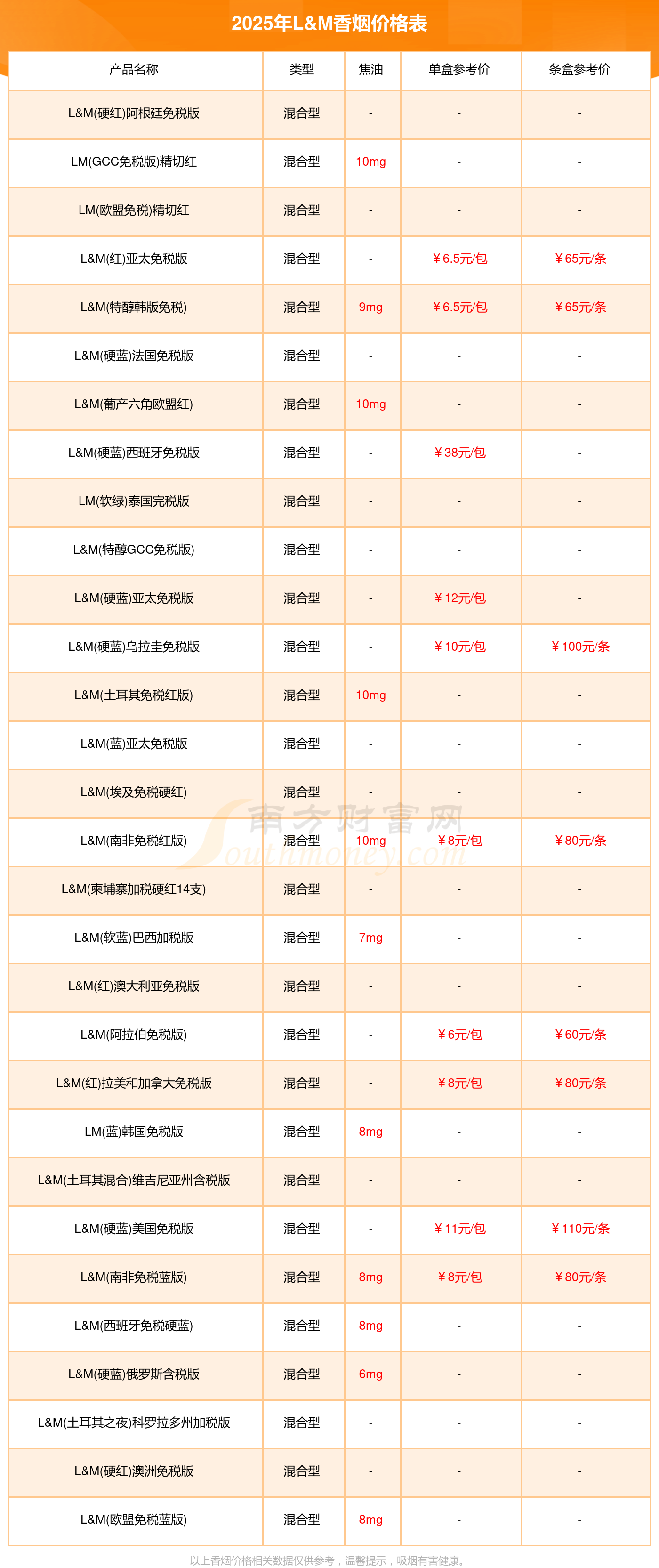 2025L&M香煙最新價(jià)格:L&M(硬藍(lán))西班牙免稅版參考價(jià)38.0元/包、L&M(硬藍(lán))亞太免稅版參考價(jià)12.0元/包、L&M(美國(guó)免稅硬紅)參考價(jià)11.0元/包。
