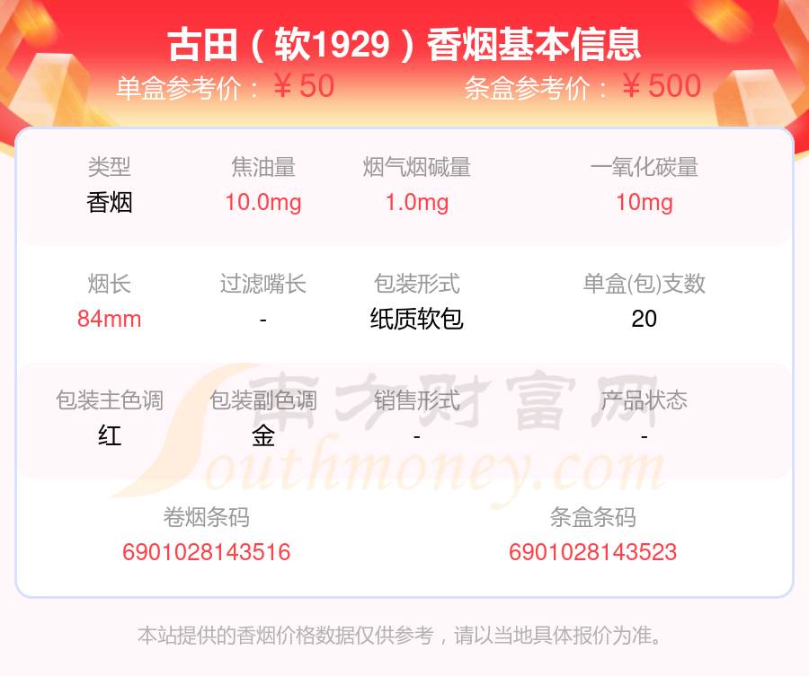 擇煙網(wǎng)為大家盤(pán)點(diǎn)了55元左右的古田香煙,有古田(軟1929)、古田(金中支)、七匹狼(古田金中支)等,詳細(xì)價(jià)格如下: