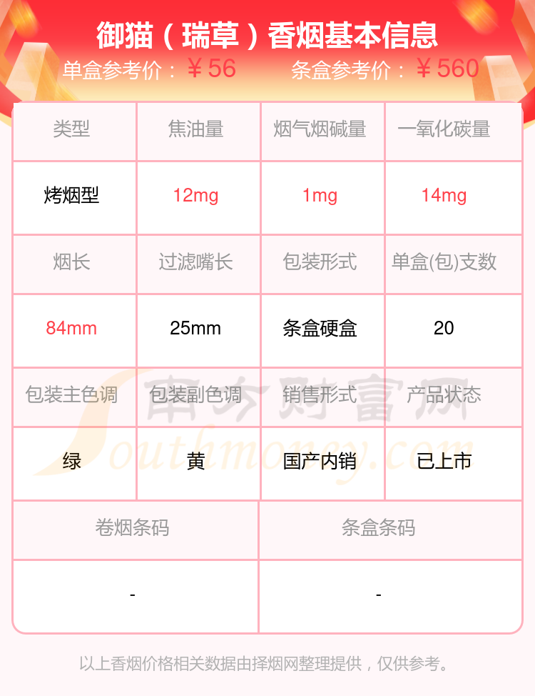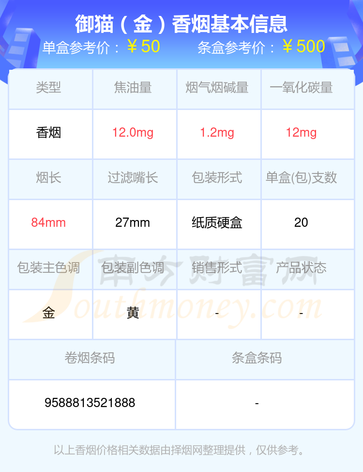 御貓香煙高于50元的煙有御貓(瑞草)、御貓(金)等,具體價格如下: