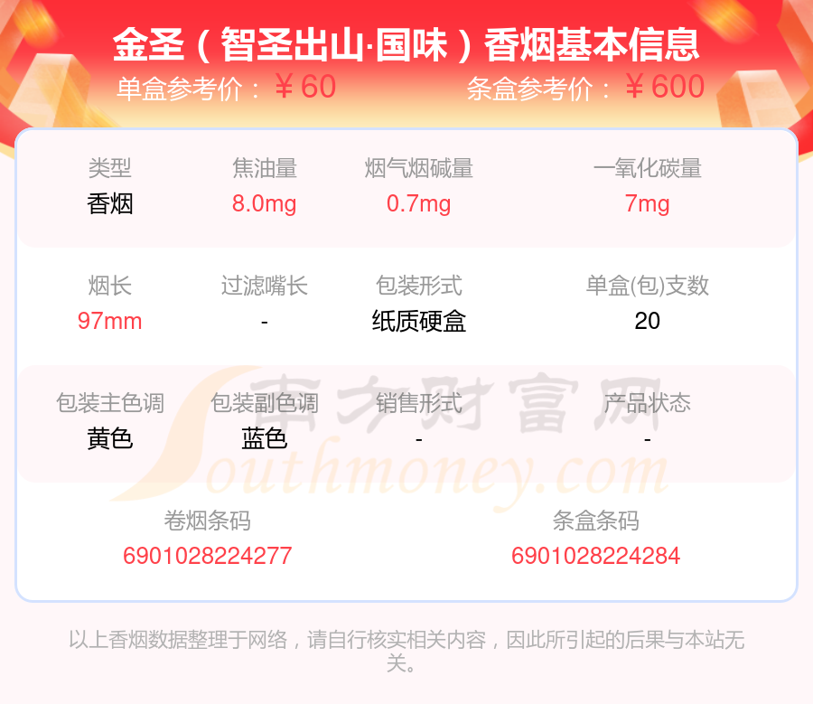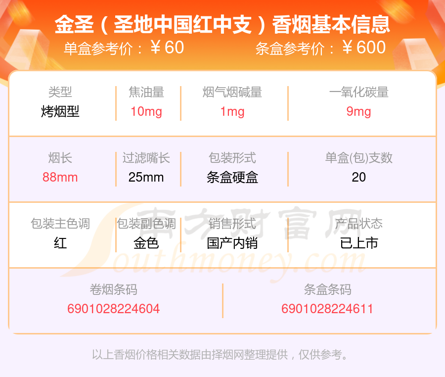 金圣香煙60到80元左右的煙分別有金圣(典藏瑞香)參考價65.0元/包、金圣(智圣出山·國味)參考價60.0元/包、金圣(圣地中國紅中支)參考價60元/包等。