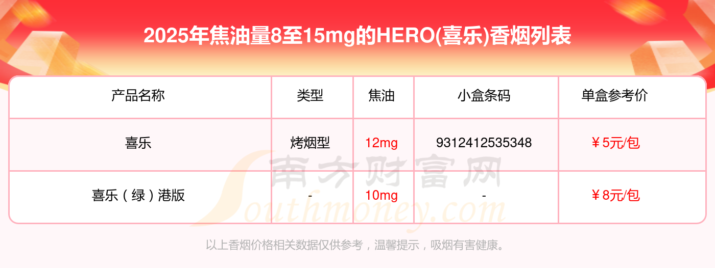 2025年焦油量8至15mg的HERO(喜樂)香煙列表一覽