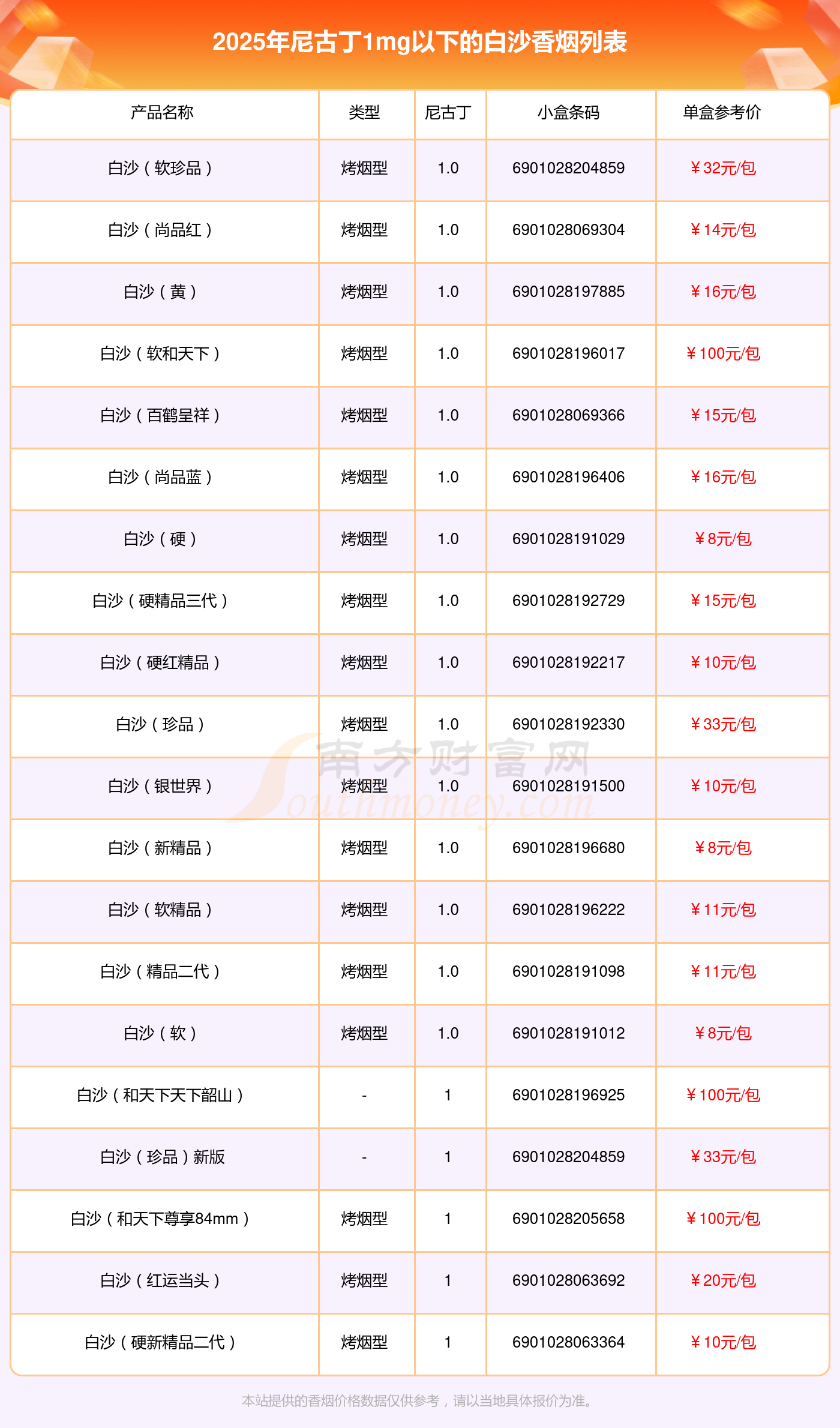 白沙香煙尼古丁1mg以下的煙有白沙(軟珍品)、白沙(尚品紅)、白沙(黃)、白沙(軟和天下)、白沙(百鶴呈祥)、白沙(尚品藍)、白沙(硬)、白沙(硬精品三代)、白沙(硬紅精品)、白沙(珍品)等,具體價格如下: