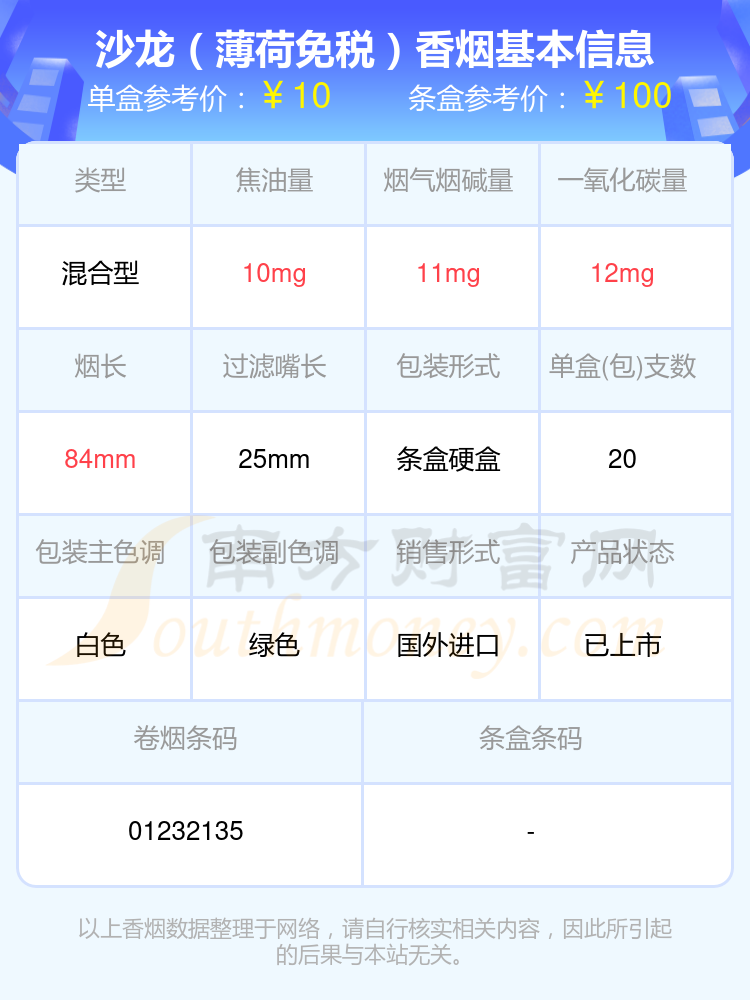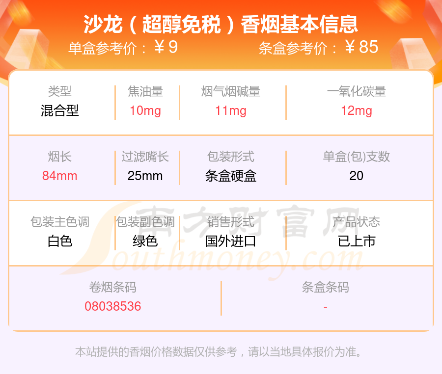 沙龍(薄荷免稅)參考價(jià)10元/包、沙龍(超醇免稅)參考價(jià)9元/包等。
