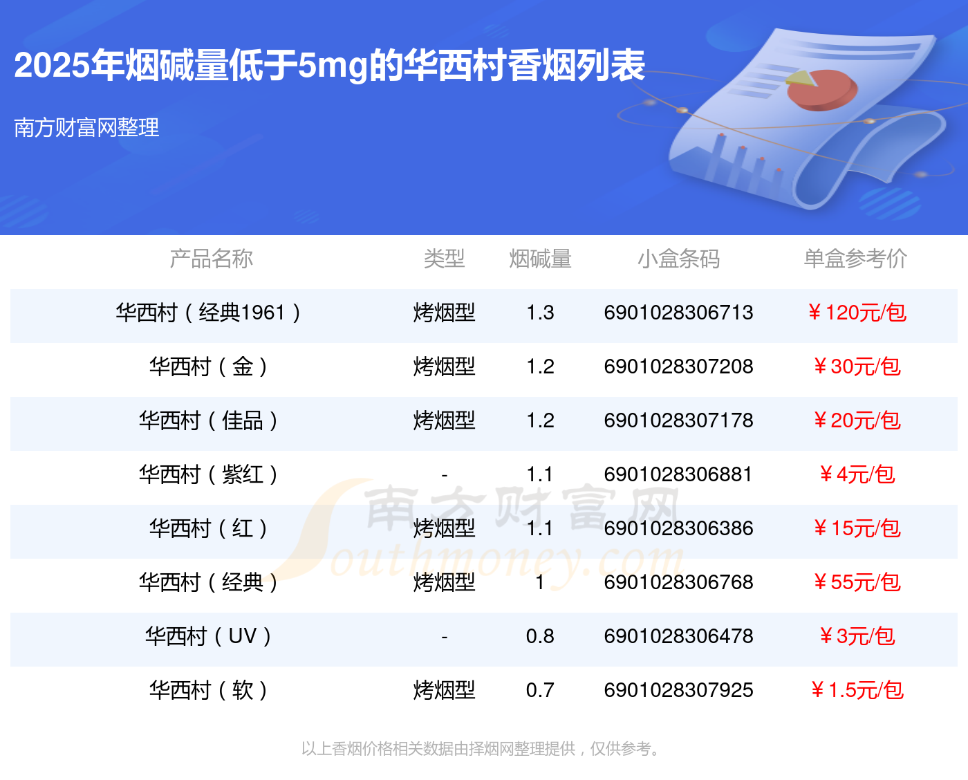 擇煙網(wǎng)為大家盤點(diǎn)了華西村香煙煙堿量低于5mg的,分別有華西村(經(jīng)典1961)、華西村(金)、華西村(佳品)、華西村(紫紅)、華西村(紅)、華西村(經(jīng)典)、華西村(UV)、華西村(軟)等,詳細(xì)價(jià)格如下: