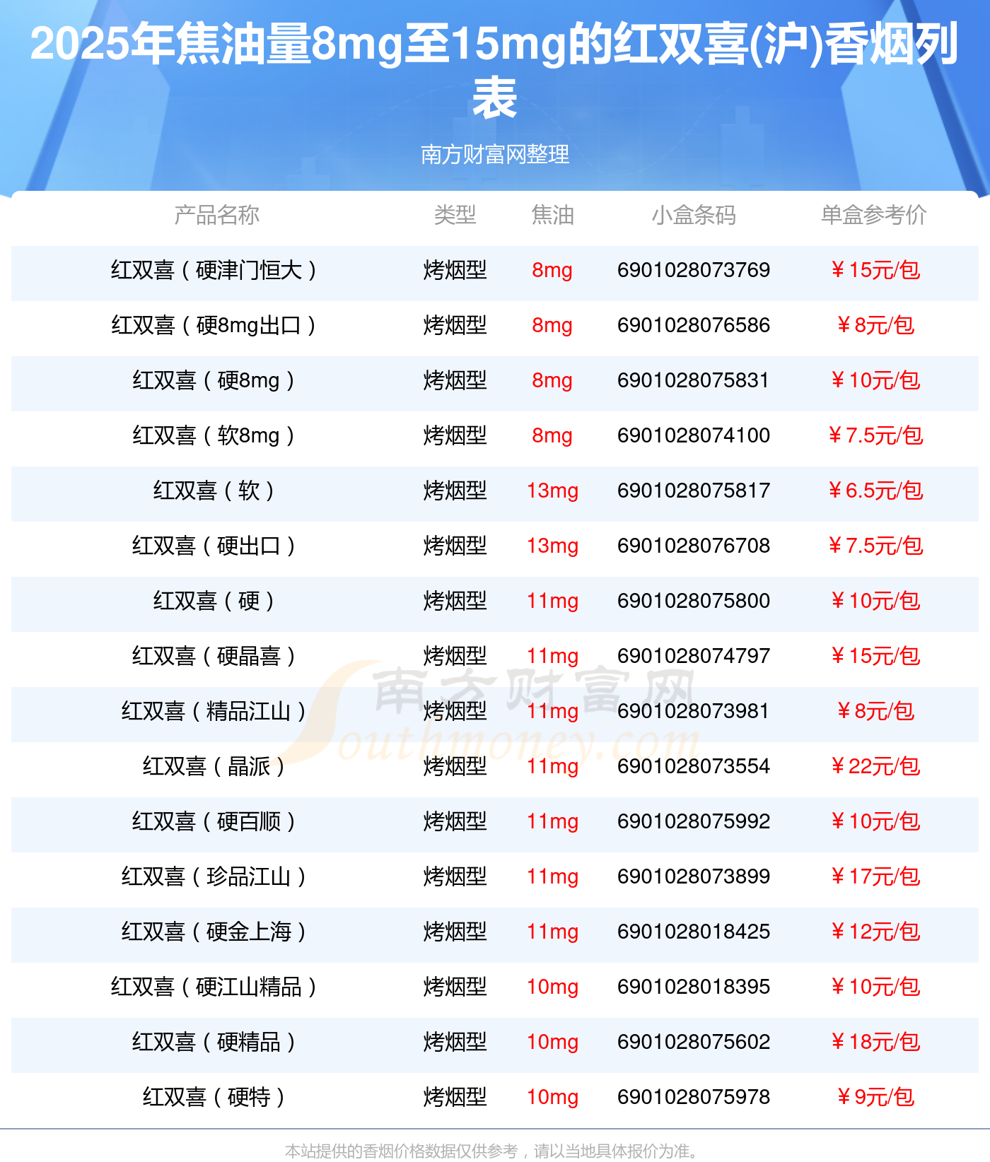 擇煙網(wǎng)為大家盤(pán)點(diǎn)了焦油量8mg至15mg的紅雙喜(滬)香煙,有紅雙喜(硬津門(mén)恒大)、紅雙喜(硬8mg出口)、紅雙喜(硬8mg)、紅雙喜(軟8mg)、紅雙喜(軟)、紅雙喜(硬出口)、紅雙喜(硬)、紅雙喜(硬晶喜)、紅雙喜(精品江山)、紅雙喜(晶派)等,詳細(xì)價(jià)格如下: