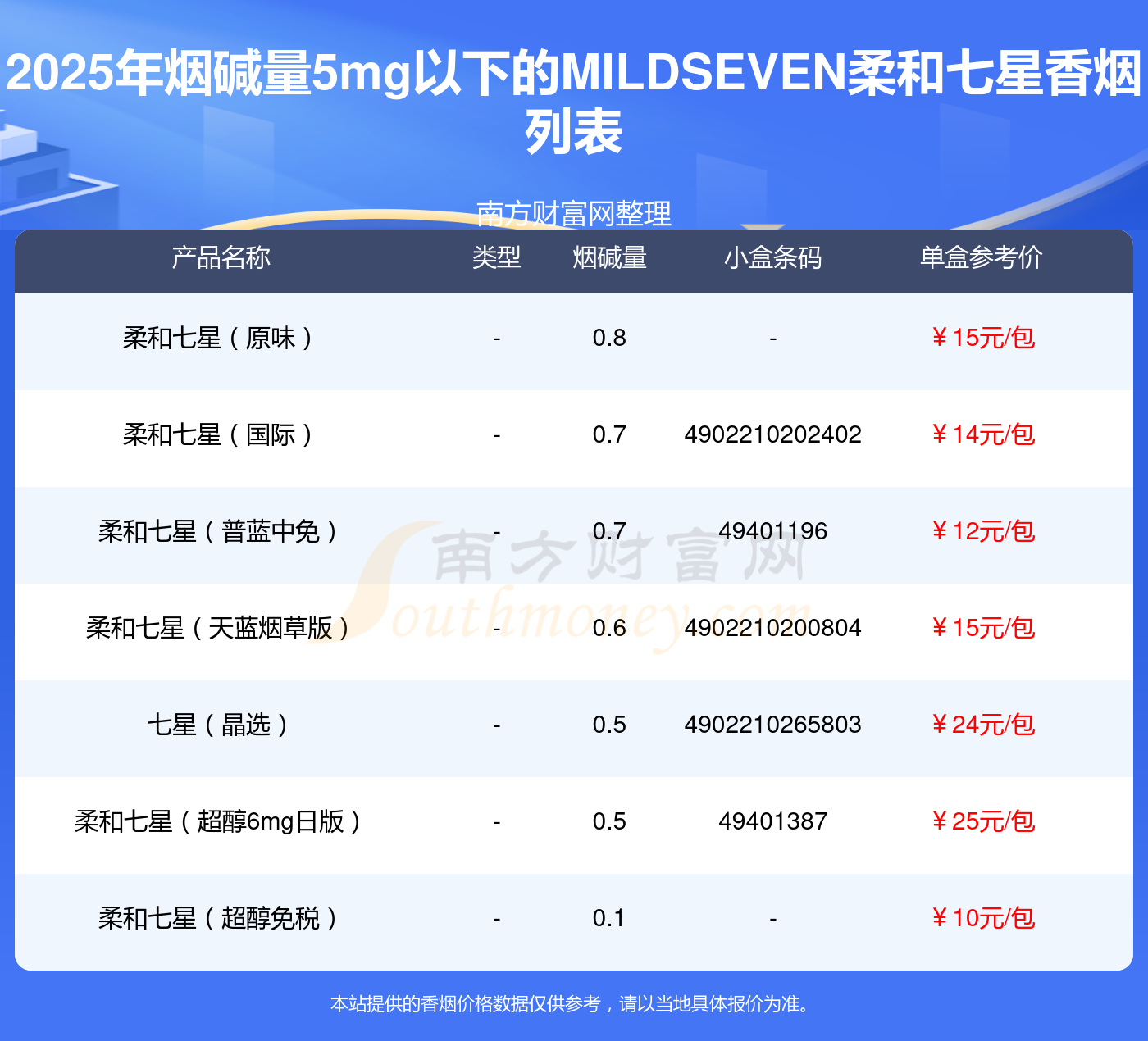 擇煙網(wǎng)為大家盤點了MILDSEVEN柔和七星香煙煙堿量5mg以下的,分別有柔和七星(原味)、柔和七星(國際)、柔和七星(普藍中免)、柔和七星(天藍煙草版)、七星(晶選)、柔和七星(超醇6mg日版)、柔和七星(超醇免稅)等,具體價格如下: