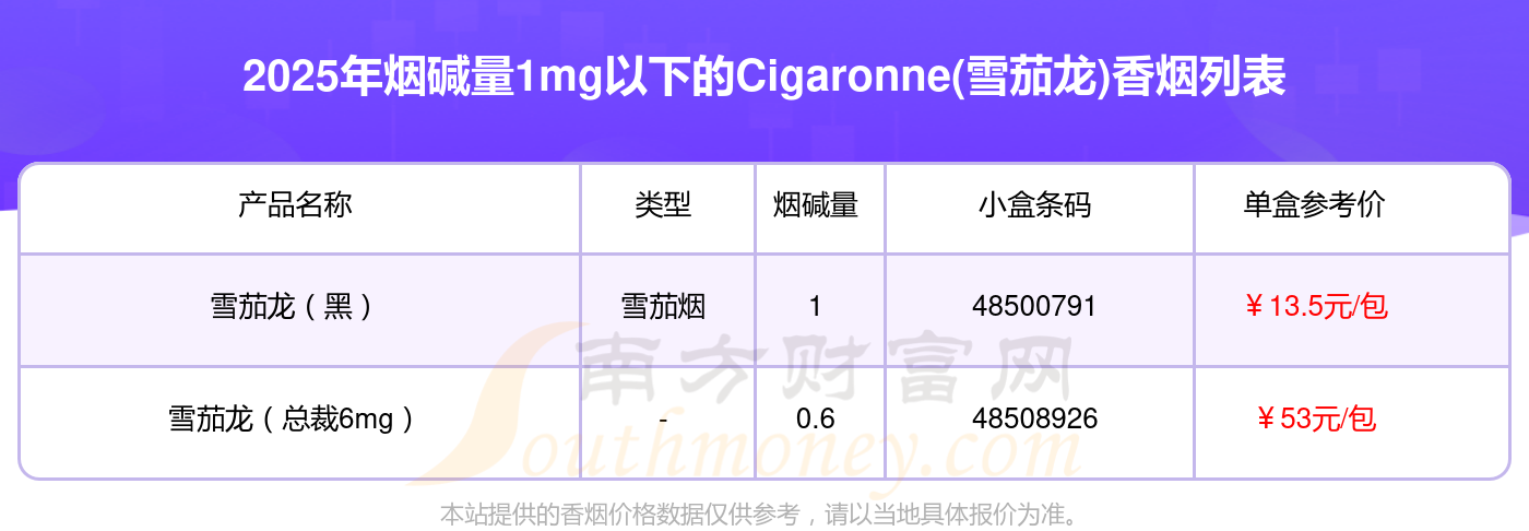 Cigaronne(雪茄龍)香煙煙堿量1mg以下的煙有雪茄龍(黑)、雪茄龍(總裁6mg)等,詳細(xì)價(jià)格如下: