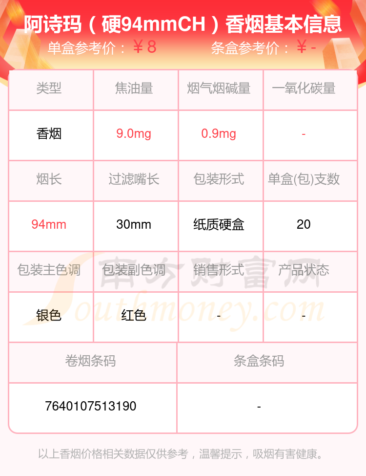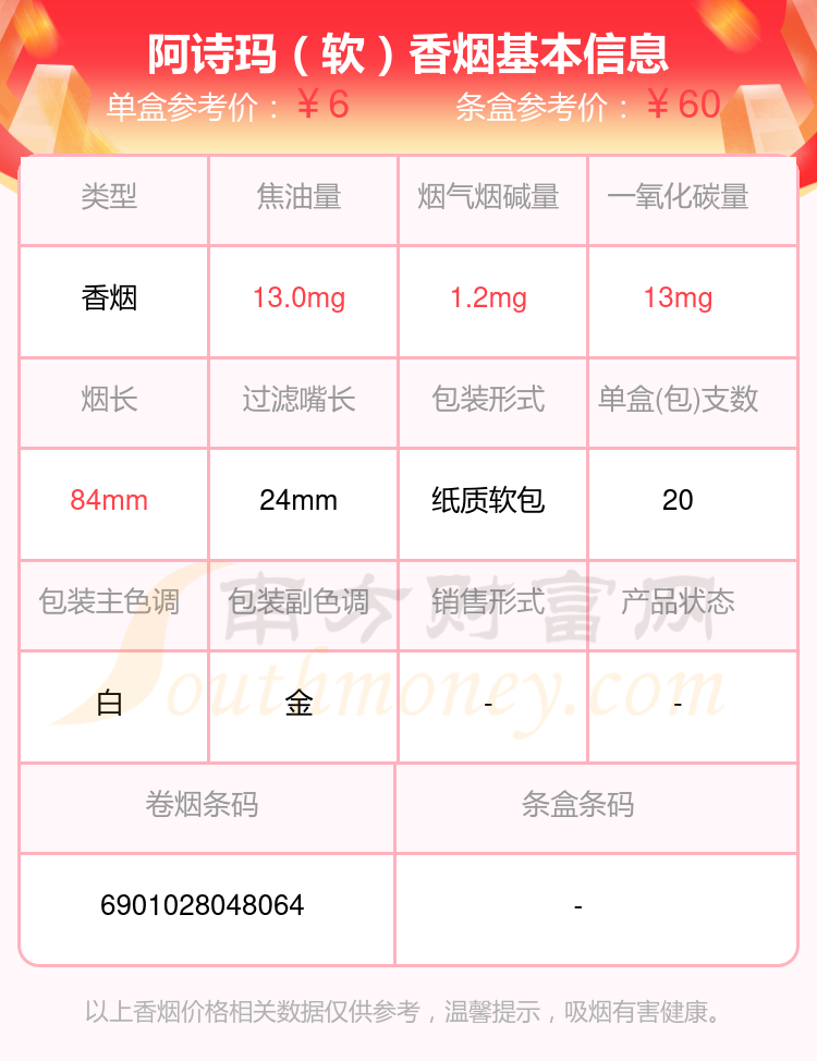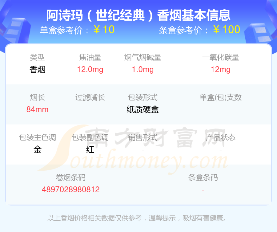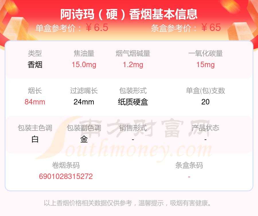 擇煙網(wǎng)為大家盤(pán)點(diǎn)了焦油量8mg到15mg左右的阿詩(shī)瑪香煙,分別有阿詩(shī)瑪(硬94mmCH)、阿詩(shī)瑪(硬)、阿詩(shī)瑪(鉑金)、阿詩(shī)瑪(軟)、阿詩(shī)瑪(世紀(jì)經(jīng)典)、阿詩(shī)瑪(硬KH)、阿詩(shī)瑪(金)、阿詩(shī)瑪(硬金)、阿詩(shī)瑪(92MM驚鴻寬版)、阿詩(shī)瑪(驚鴻寬版92MM)等,具體價(jià)格如下: