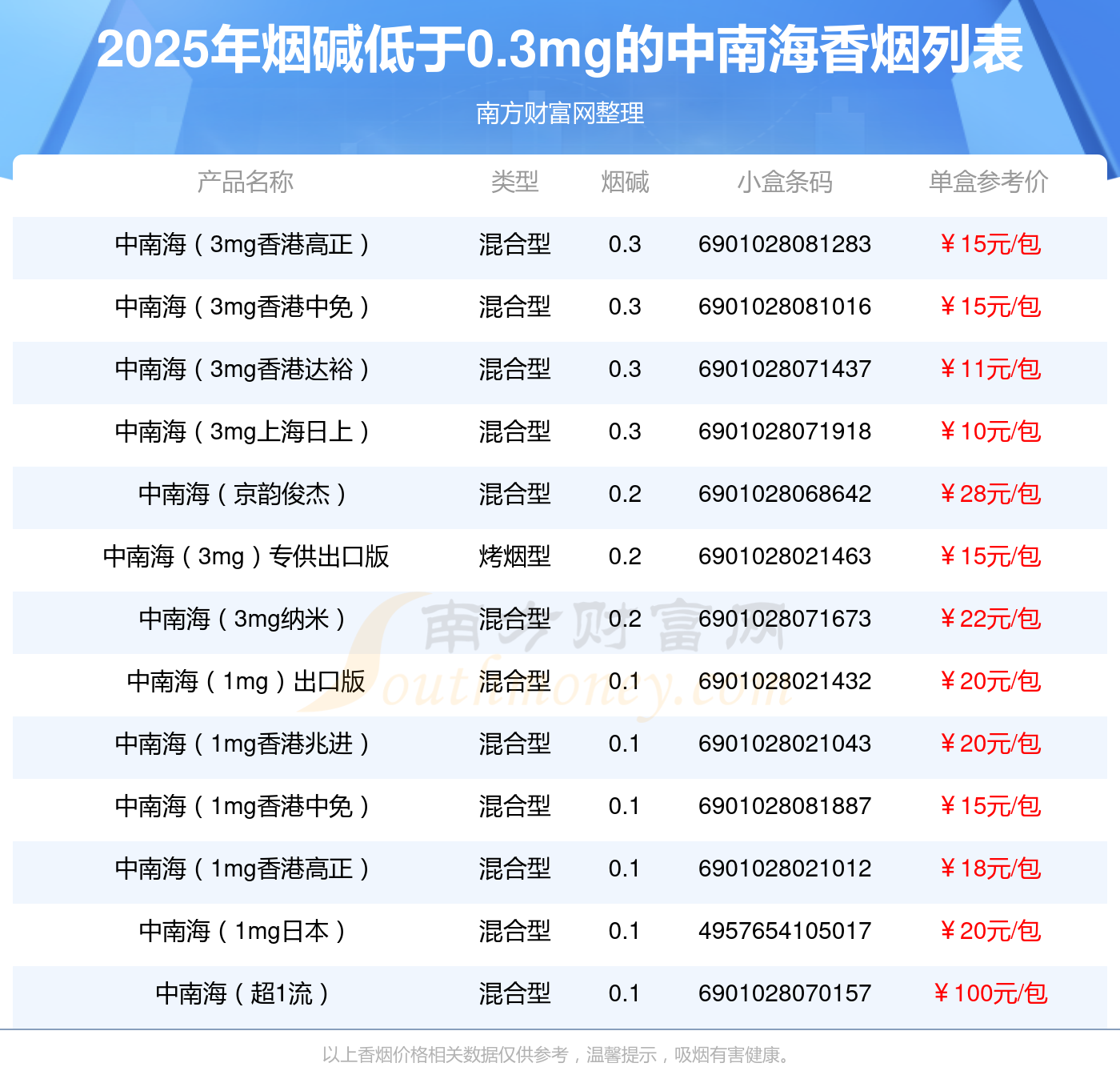 煙堿低于0.3mg的中南海香煙有哪些?擇煙網(wǎng)為大家整理盤點(diǎn),分別有: