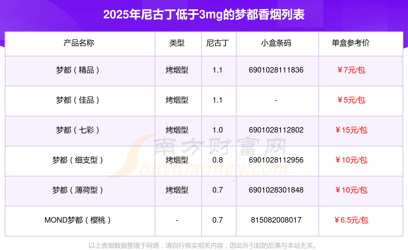 夢都香煙尼古丁低于3mg的煙有夢都(精品)、夢都(佳品)、夢都(七彩)、夢都(細支型)、夢都(薄荷型)、MOND夢都(櫻桃)等,具體價格如下: