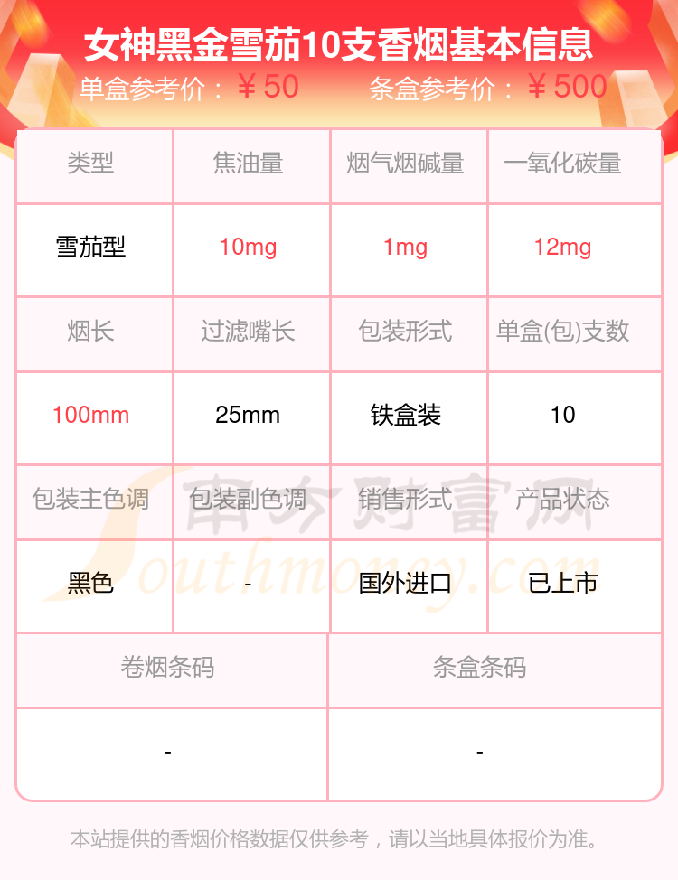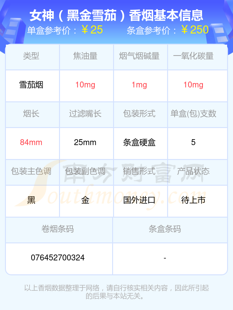 煙堿量低于2mg的JEWELS(女神)香煙有哪些?擇煙網(wǎng)為大家整理盤點(diǎn),分別有:女神黑金雪茄10支、女神(黑金雪茄)等,具體價(jià)格如下: