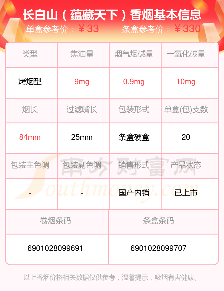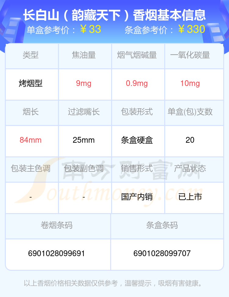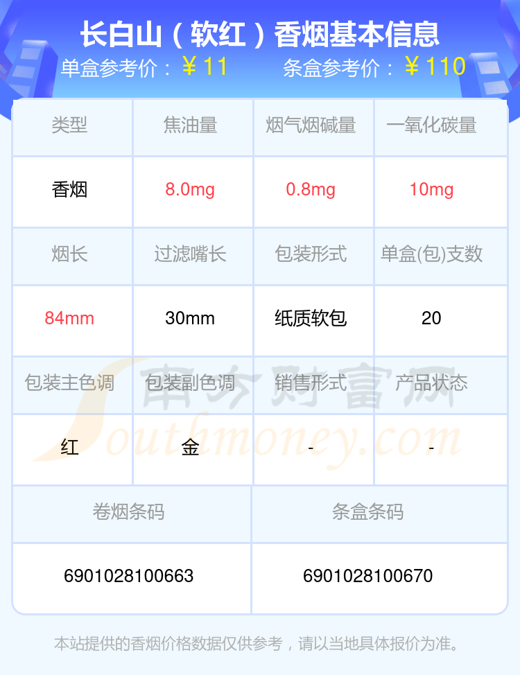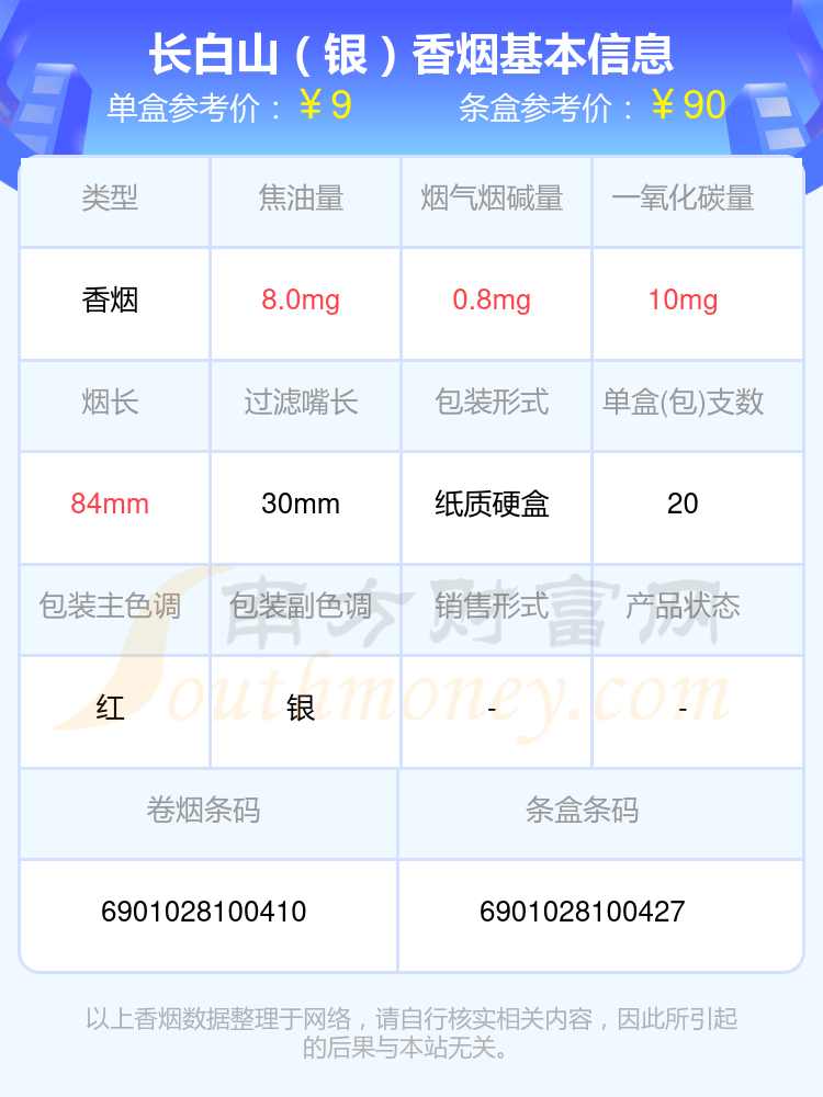 長白山香煙焦油量8到15mg的煙有長白山(丹韻)、長白山(迎春中支)、長白山(韻藏天下)、長白山(蘊藏天下)、長白山(圣境)、長白山(鴻運)、長白山(攬勝)、長白山(紅)、長白山(軟紅)、長白山(銀)等,詳細價格如下: