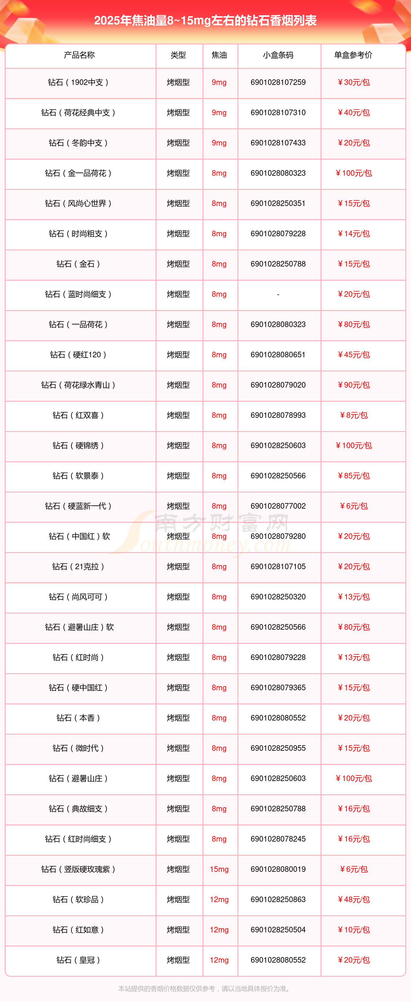 擇煙網(wǎng)為大家盤點了焦油量8~15mg左右的鉆石香煙,有以下這些: