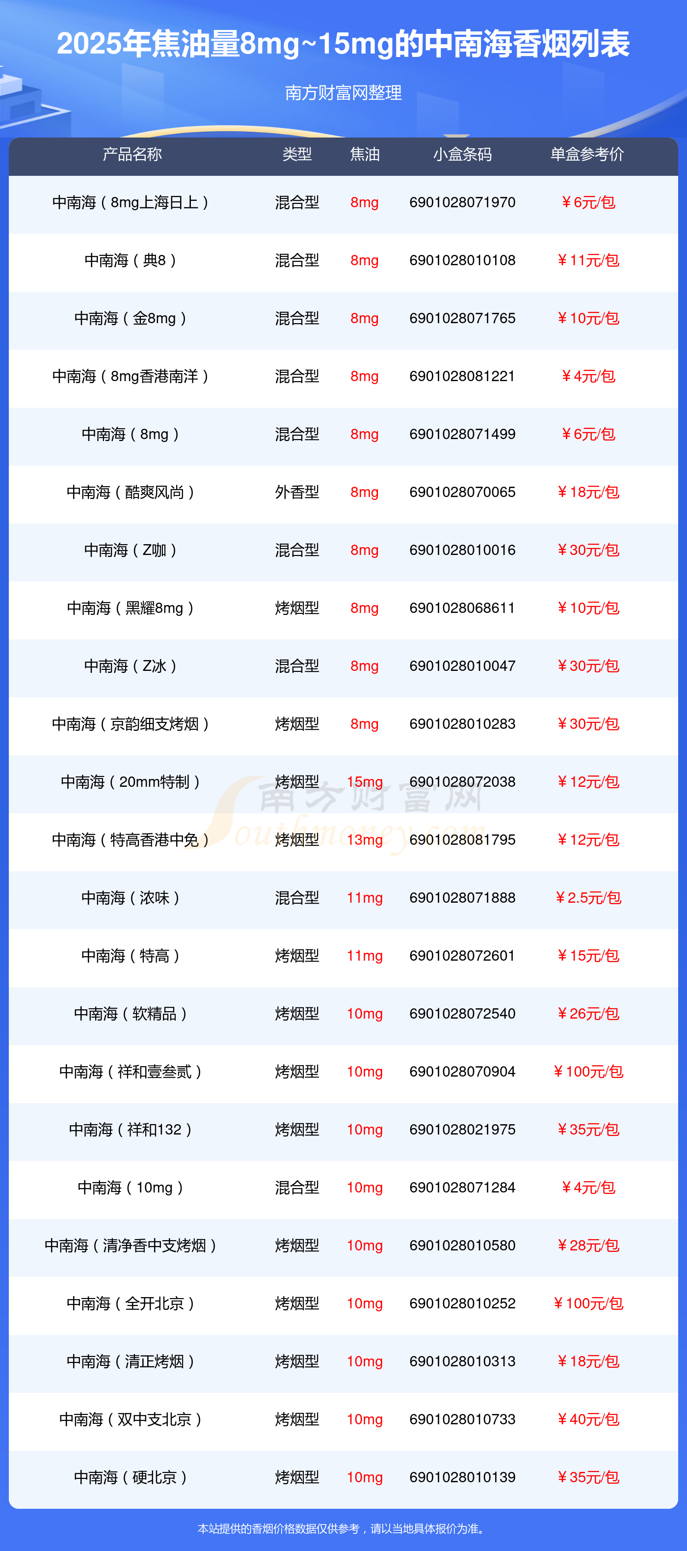 擇煙網(wǎng)為大家盤點(diǎn)了中南海香煙焦油量8mg~15mg的煙,有以下這些:
