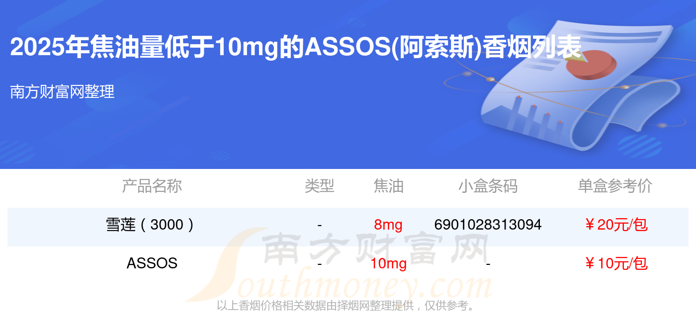 ASSOS(阿索斯)香煙焦油量低于10mg的煙有雪蓮(3000)、ASSOS等,具體價格如下: