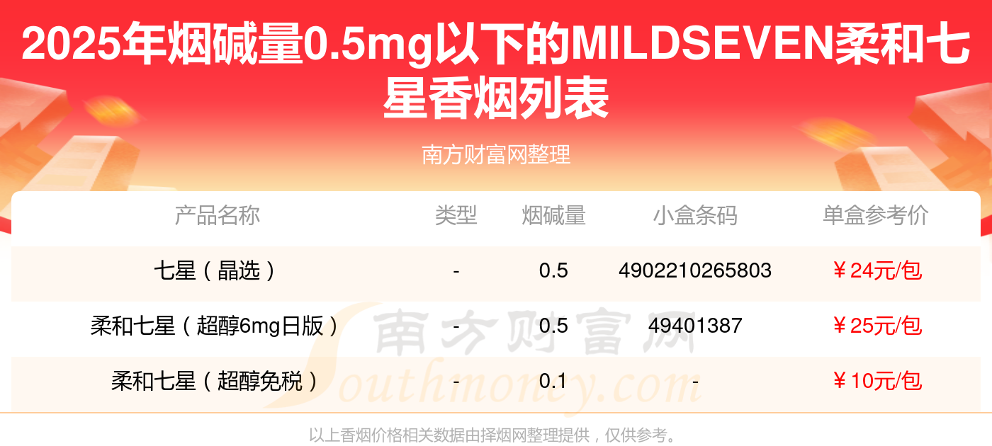 煙堿量0.5mg以下的MILDSEVEN柔和七星香煙有哪些?擇煙網(wǎng)為大家整理盤點(diǎn),有七星(晶選)、柔和七星(超醇6mg日版)、柔和七星(超醇免稅)等,詳細(xì)價(jià)格如下: