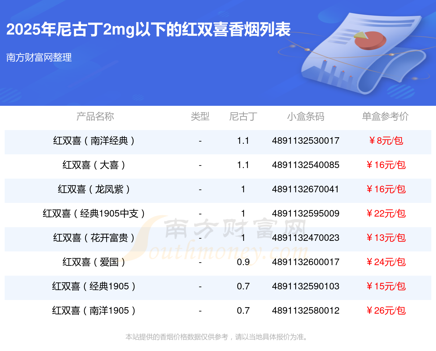 紅雙喜香煙尼古丁2mg以下的有哪些?擇煙網(wǎng)為大家整理提供,分別有: