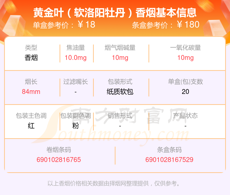 黃金葉(軟洛陽牡丹)參考價(jià)18.0元/包、黃金葉(百年濃香)典藏參考價(jià)42.0元/包等。