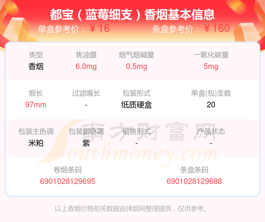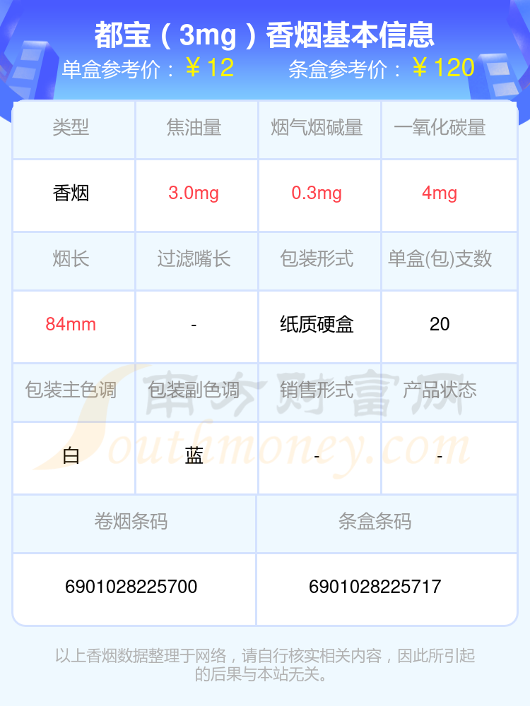 都寶(藍(lán)莓細(xì)支)參考價(jià)16.0元/包、都寶(1毫克)參考價(jià)45元/包、都寶(3mg)參考價(jià)12.0元/包、都寶(純正1號(hào))參考價(jià)50元/包等。