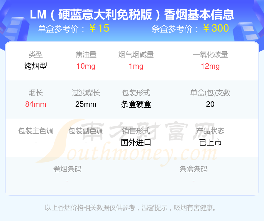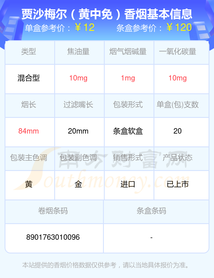 JAISALMER(賈沙梅爾)香煙煙堿2mg以下的煙有LM(硬藍(lán)意大利免稅版)、賈沙梅爾薄荷、賈沙梅爾(黃中免)、L&M(硬紅歐盟免稅版)等,具體價(jià)格如下: