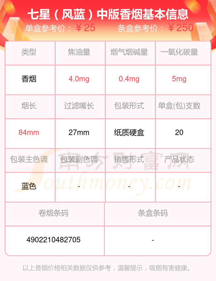 MEVIUS(梅比烏斯)香煙焦油量4mg以下的煙分別有七星(風(fēng)藍)中版參考價25.0元/包、七星(1mg)中版參考價35.0元/包等。