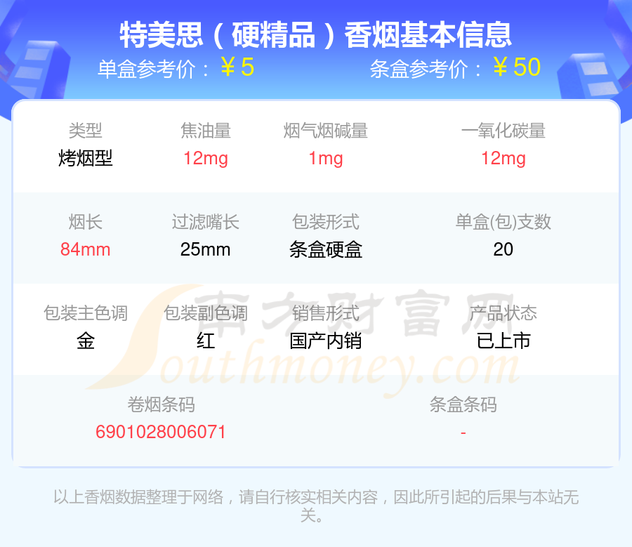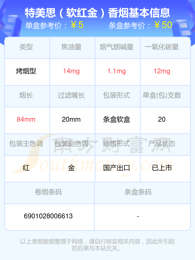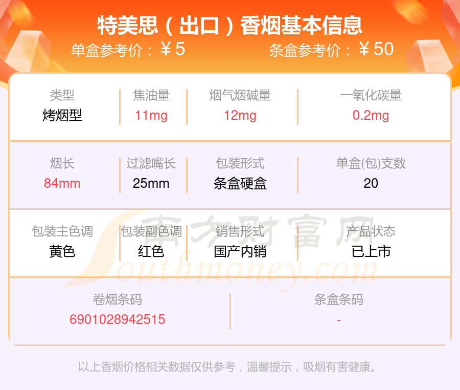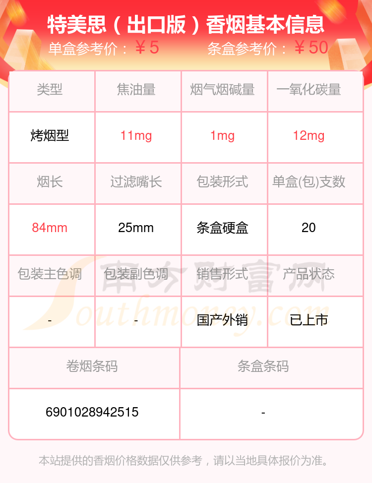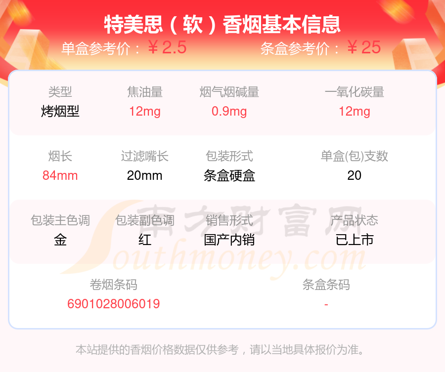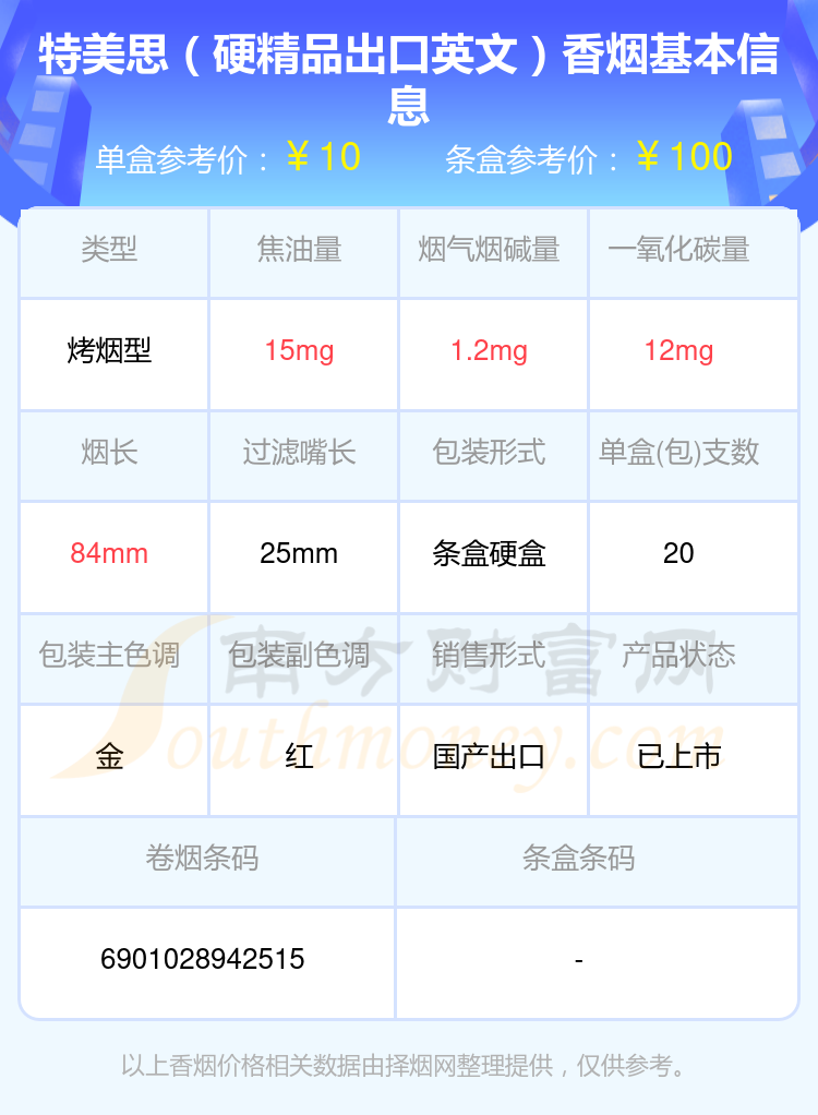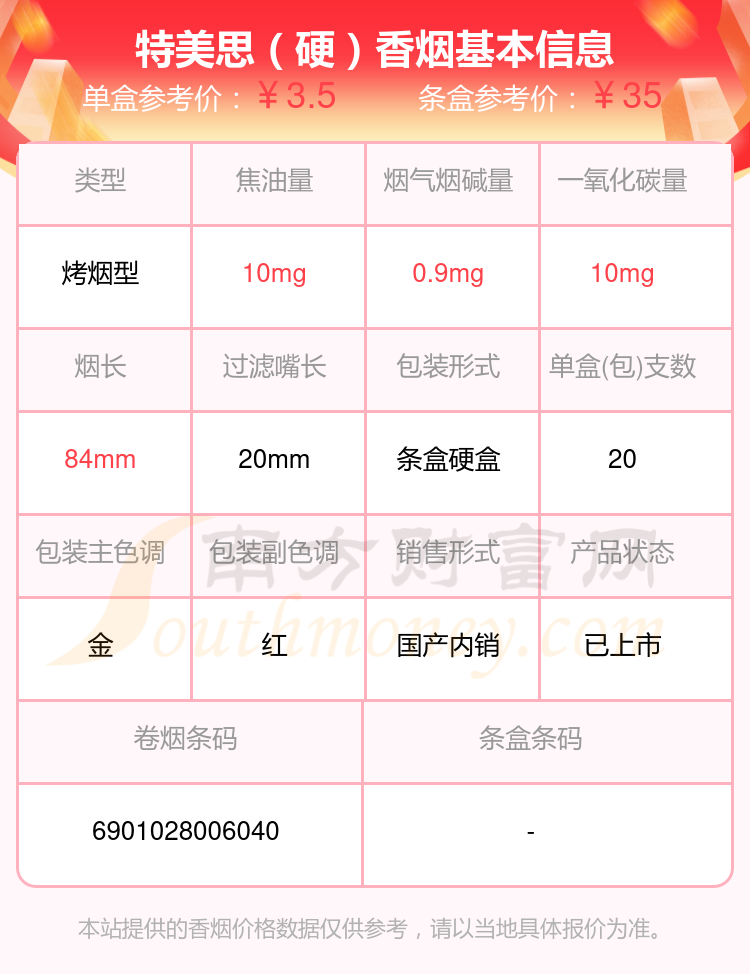 特美思(硬精品出口英文)參考價(jià)10元/包、特美思(軟紅金)參考價(jià)5元/包、特美思(軟)參考價(jià)2.5元/包、特美思(硬精品)參考價(jià)5元/包、特美思(出口版)參考價(jià)5元/包、特美思(出口)參考價(jià)5元/包、特美思(硬)參考價(jià)3.5元/包等。