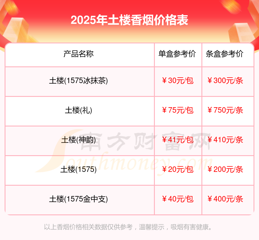 2025年土樓香煙土樓(禮)、土樓(神韻)、土樓(1575金中支)、土樓(1575冰抹茶)、土樓(1575)等最新價(jià)格如下:土樓(禮)參考價(jià)75.0元/包、土樓(神韻)參考價(jià)41.0元/包、土樓(1575金中支)參考價(jià)40.0元/包、土樓(1575冰抹茶)參考價(jià)30.0元/包、土樓(1575)參考價(jià)20.0元/包。