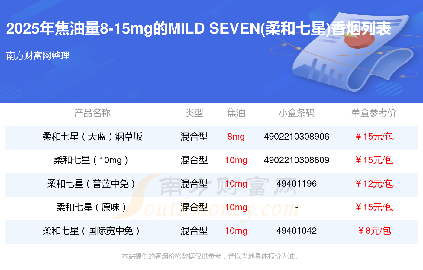 擇煙網(wǎng)為大家盤點了MILD SEVEN(柔和七星)香煙焦油量8-15mg的煙,有以下這些: